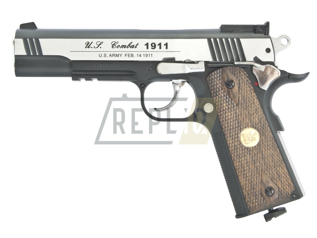 Airsoftová replika Coltu 1911 na plastové BB kuličky 6mm a pohonem CO2.Téměř celokovová konstrukce pistole je doplněna částečně polymerovým spodním rámem s rukojetí v imitaci dřeva. To znamená, že z kovu je samozřejmě hlaveń, spoušt, závěr a další doplňky.