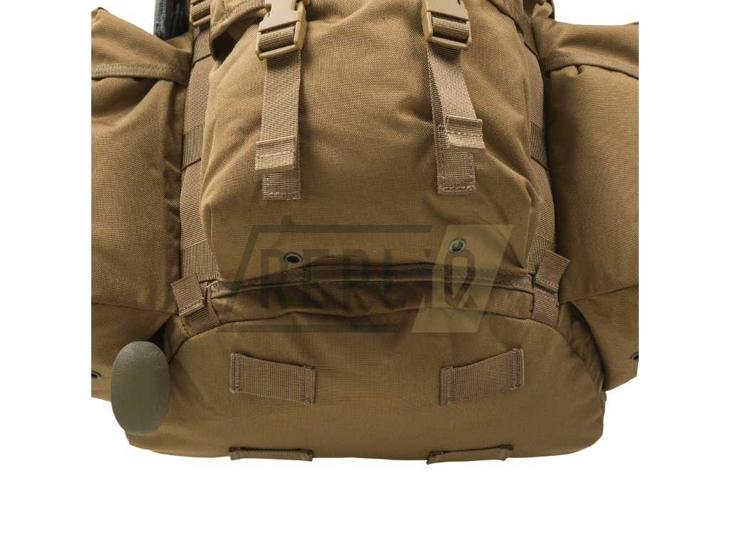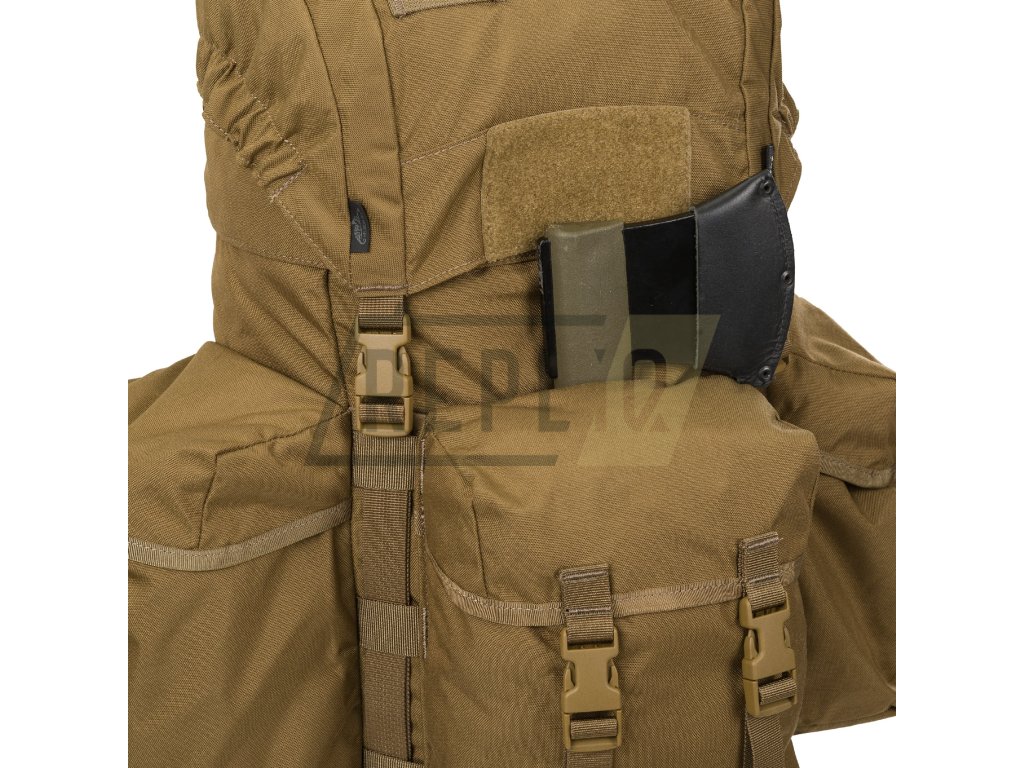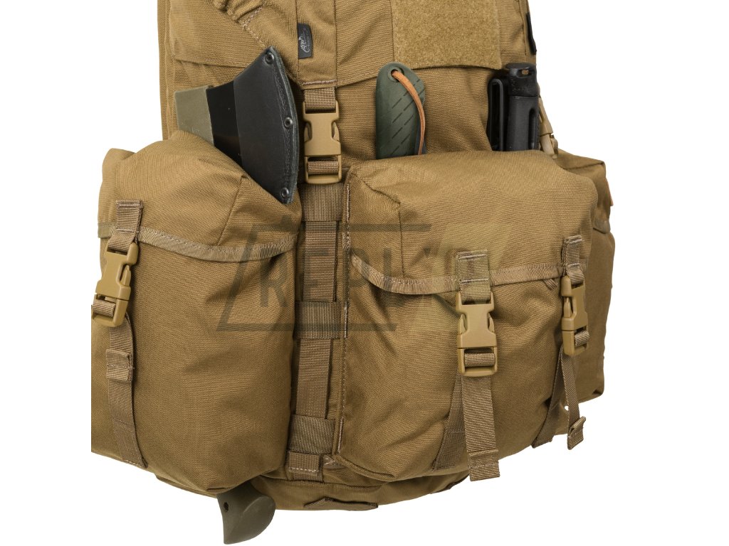 Na exteriéru batohu jsou umístěny tři samostatné kapsy uzavírané chlopněmi s FASTEX přezkami. Vnitřek těchto kapes je holý, prostřední kapsa se dá navíc stáhnout pomocí šňůrky s brzdičkou. Příjemným bonusem je, že za tyto kapsy můžete bez problémů vložit dodatečnou výbavu jako jsou sekery, pily apod. Pokud rádi využíváte MOLLE/PALS systém, dozajista váš potěší pruh vazby umístěný zhruba na středu batohu.