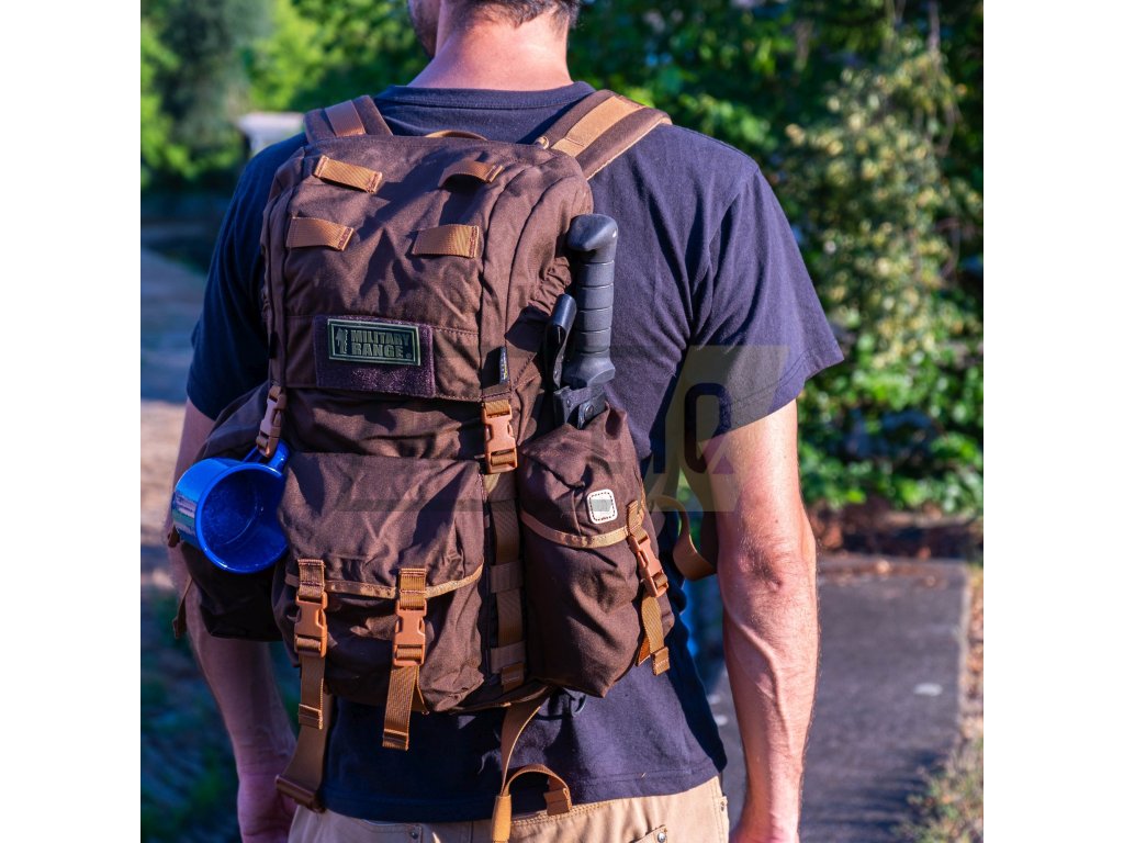Na exteriéru batohu jsou umístěny tři samostatné kapsy uzavírané chlopněmi s FASTEX přezkami. Vnitřek těchto kapes je holý, prostřední kapsa se dá navíc stáhnout pomocí šňůrky s brzdičkou. Příjemným bonusem je, že za tyto kapsy můžete bez problémů vložit dodatečnou výbavu jako jsou sekery, pily apod. Pokud rádi využíváte MOLLE/PALS systém, dozajista váš potěší pruh vazby umístěný zhruba na středu batohu.