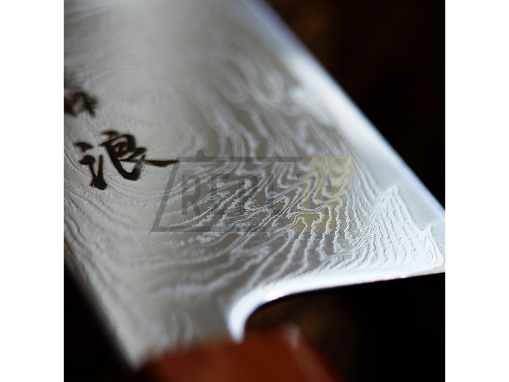 Damaškové nože Hokiyama Sakon Bokusui ROU-Wave s velmi výrazným 32-vrstvým damaškovým vzorem, který obohacuje vizuální stránku čepele - tento vzor je u každého nože jedinečný a nelze jej napodobit. Damaškový vzor je zčásti oblý a zčásti zakřivený, odtud název vířivý damašek. Stejně jako otisk prstu, ani jedna čepel není stejná. Celá čepel je vyleštěna do zrcadlového lesku. Můžete se v ní vidět! Na samém okraji si lze všimnout výrazné, křivkové linie (matný povrch), která se táhne po celé délce čepele. Jedná se o linii mezi jádrem a 32 měkčími, vnějšími vrstvami oceli, které slouží jako dodatečná ochrana ocelového jádra. Takovému sendviči tvrdší oceli jádra a měkčí vnější oceli se říká san-mai clad. Tímto způsobem se vyrábí většina dnešních japonských nožů.