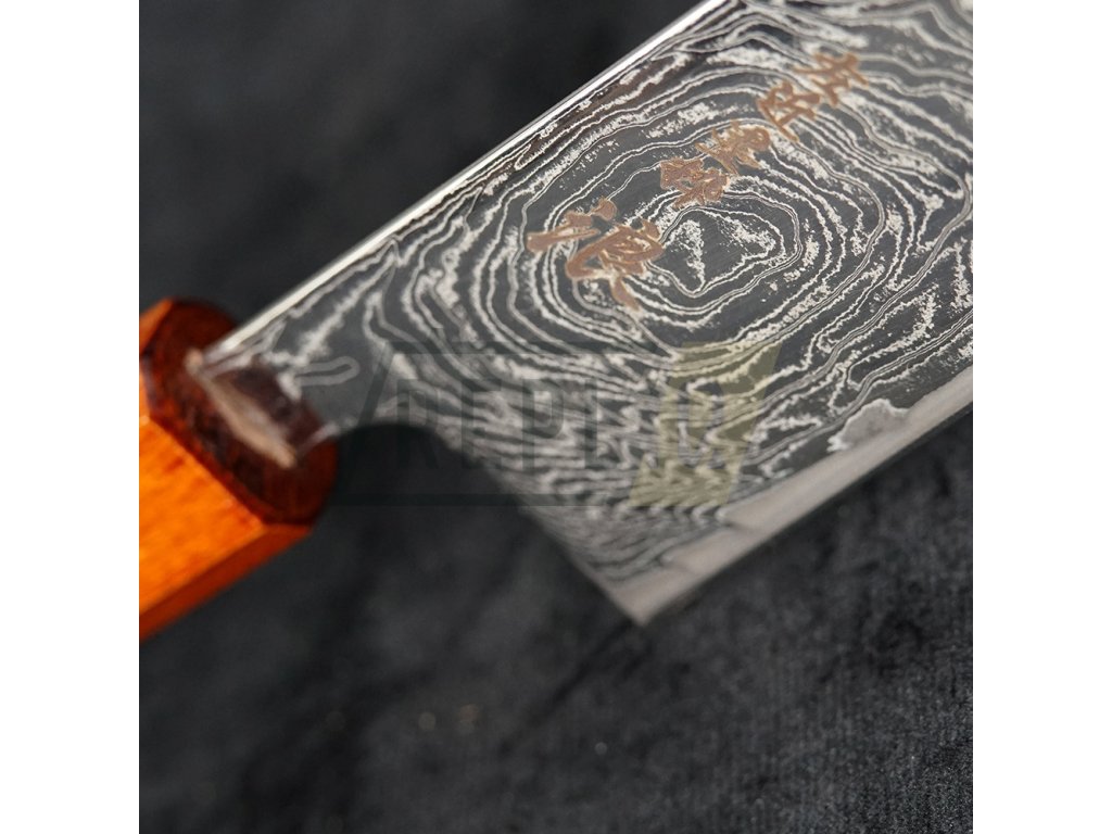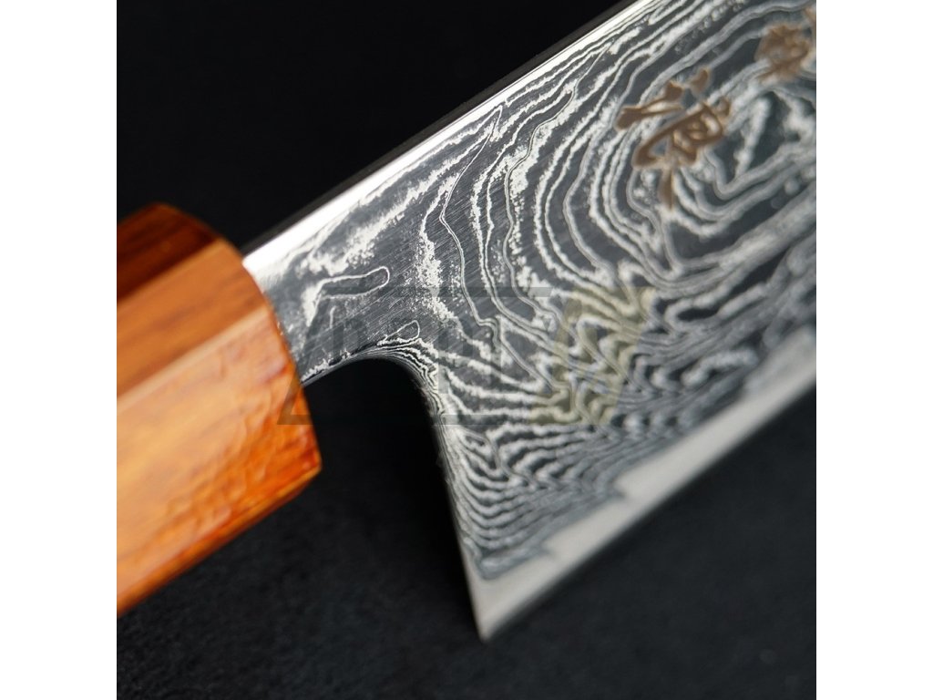 Damaškové nože Hokiyama Sakon Bokusui ROU-Wave s velmi výrazným 32-vrstvým damaškovým vzorem, který obohacuje vizuální stránku čepele - tento vzor je u každého nože jedinečný a nelze jej napodobit. Damaškový vzor je zčásti oblý a zčásti zakřivený, odtud název vířivý damašek. Stejně jako otisk prstu, ani jedna čepel není stejná. Celá čepel je vyleštěna do zrcadlového lesku. Můžete se v ní vidět! Na samém okraji si lze všimnout výrazné, křivkové linie (matný povrch), která se táhne po celé délce čepele. Jedná se o linii mezi jádrem a 32 měkčími, vnějšími vrstvami oceli, které slouží jako dodatečná ochrana ocelového jádra. Takovému sendviči tvrdší oceli jádra a měkčí vnější oceli se říká san-mai clad. Tímto způsobem se vyrábí většina dnešních japonských nožů.