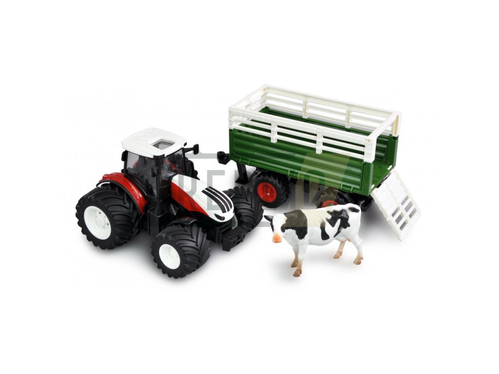 Krásný RC TRAKTOR 2,4 Ghz se sklápěcím vozem pro zvířata, LED světla, zvukový modul, vhodný od 6ti let. Měřítko 1:24 a jako bonus kravička v balení rozzáří oči každého malého farmáře!
