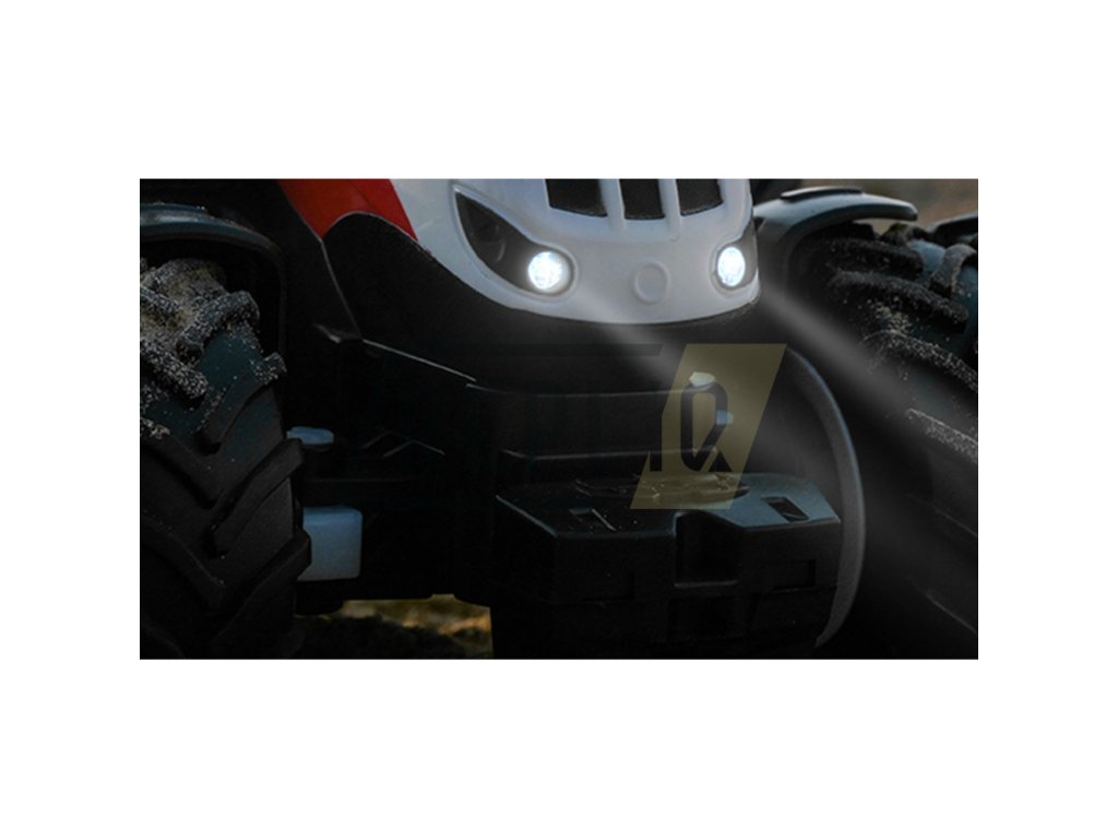 Traktor svítí a vydává realistické zvuky, jezdí vpřed, vzad, doleva, doprava. Poháněn je na veliká zadní kola, která jsou vybavena měkkými pneumatikami z pryže s hlubokým vzorkem. Kabina řidiče je vyladěná do posledního detailu a kompletně uzavřená. DEMO funkce předvede bez vašeho zásahu pohyby traktoru.
