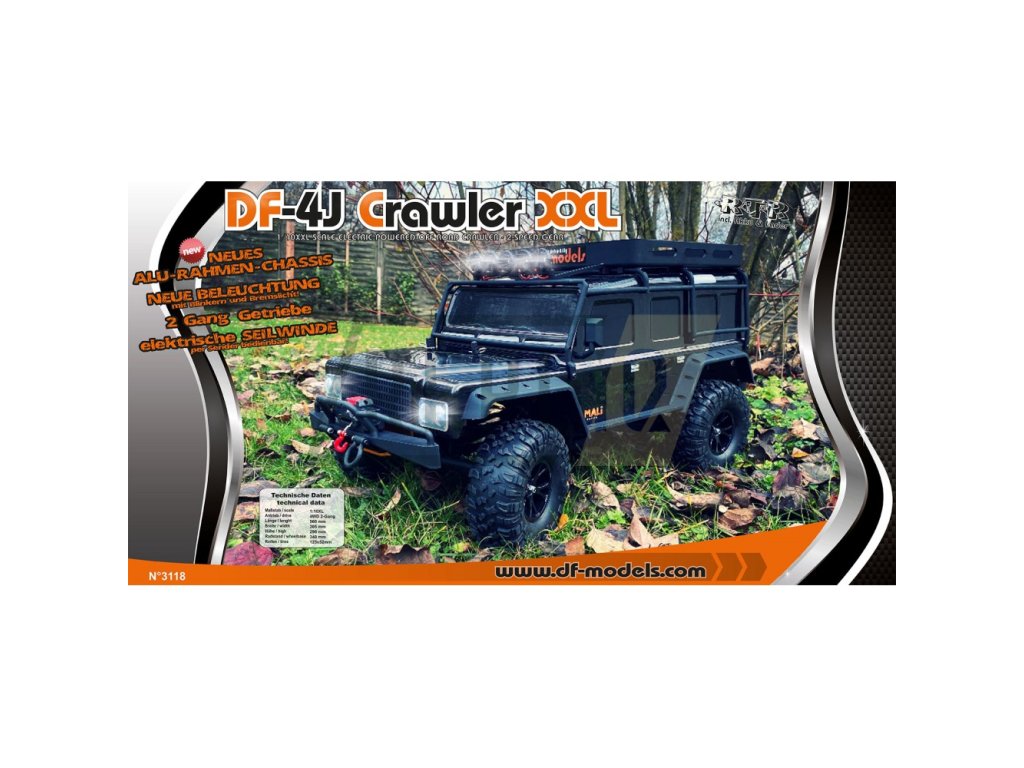DF-4J XXL Crawler je nyní vybaven již v základu hliníkovými výztuhami pro maximální pevnost. Oproti předchůdci má také ve standardu směrová a brzdová světla. Dále je vybaven stejnosměrným 60-ti závitovým motorem a s vysokým točivým momentem. Model má super měkké pneumatiky, díky kterým perfektně doslova obejme každou překážku. Diferenciály modelu jsou uzavřené a speciální elektronický regulátor typu crawler, má funkci zastavení při sjíždění ze svahu. Úhel nájezdu na překážku je až 90%, v závislosti na terénu. Elektronika je v modelu chráněna proti stříkající vodě, takže vlhkost není problém. Pevné nápravy, hliníkový rám, extrémní odpružení a mnohem více nabízejí nové modely řady DF-4J XXL! Vstupte do velkého světa "pomalých" vozidel! Model lze vylepšit řadou dalších vychytávek, jako je řízení všech čtyř kol, či tuningovými ALU hliníkovými díly. S modelem lze dosáhnout doby jízdy přes 60 minut. Převodové stupně (řazení) lze ovládat z vysílače. Vysílač má možnost díky funkci dual rate nastavit maximální rychlost 0-100%.