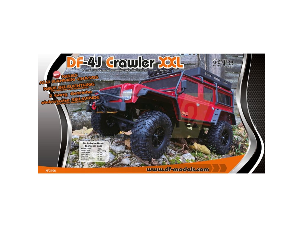 DF-4J XXL Crawler je nyní vybaven již v základu hliníkovými výztuhami pro maximální pevnost. Oproti předchůdci má také ve standardu směrová a brzdová světla. Dále je vybaven stejnosměrným 60-ti závitovým motorem a s vysokým točivým momentem. Model má super měkké pneumatiky, díky kterým perfektně doslova obejme každou překážku. Diferenciály modelu jsou uzavřené a speciální elektronický regulátor typu crawler, má funkci zastavení při sjíždění ze svahu. Úhel nájezdu na překážku je až 90%, v závislosti na terénu. Elektronika je v modelu chráněna proti stříkající vodě, takže vlhkost není problém. Pevné nápravy, hliníkový rám, extrémní odpružení a mnohem více nabízejí nové modely řady DF-4J XXL! Vstupte do velkého světa "pomalých" vozidel! Model lze vylepšit řadou dalších vychytávek, jako je řízení všech čtyř kol, či tuningovými ALU hliníkovými díly. S modelem lze dosáhnout doby jízdy přes 60 minut. Převodové stupně (řazení) lze ovládat z vysílače. Vysílač má možnost díky funkci dual rate nastavit maximální rychlost 0-100%.