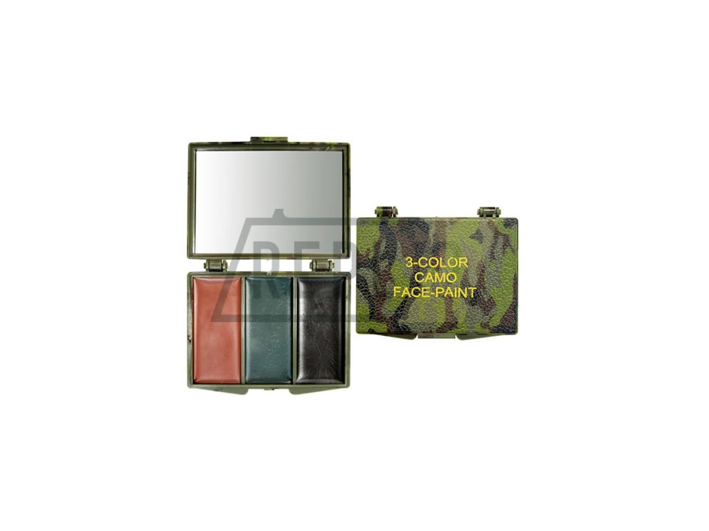Tři maskovací barvy (zelená, hnědá, černá) v plastové krabičce se zrcátkem.