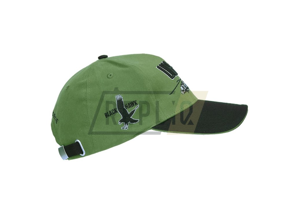 Klasická basebollová čepice v kombinaci světle zelené barvy a řerného kšiltu s motivem legendárního vrtulník UH-60.