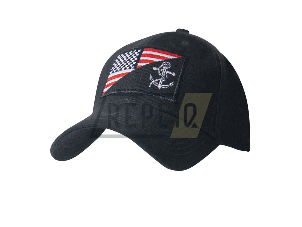 Čepice baseballka na přední straně s precizně vyšitou kotvou s lanem - znakem US Navy (americké námořnictvo) na diagonální polovině vlajky Spojených států amerických.