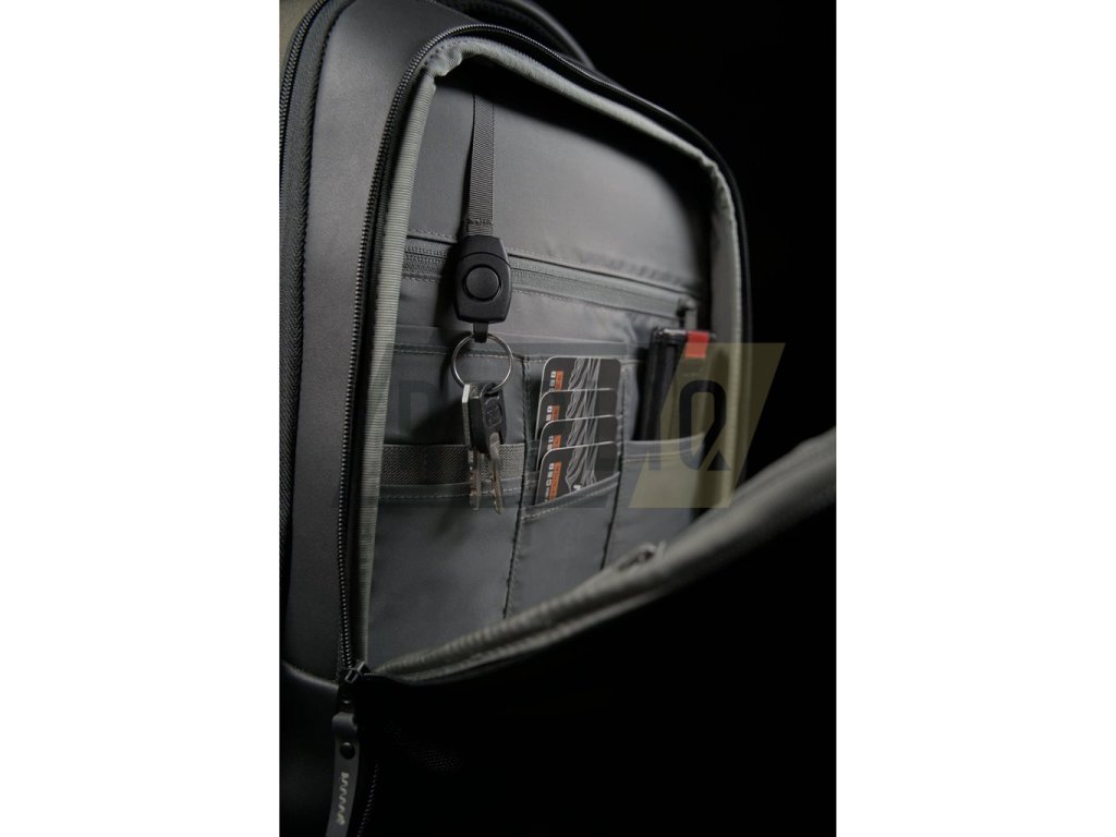 K uložení rozměrnější výbavy je batoh opatřen dvojicí komor přístupných skrze dvoucestné zipy. Přední komora je menší a obsahuje poměrně rozsáhlý organizér skládající se z několika plochých přihrádek, kapsy se zipem a plastové karabinky vhodné pro umístění například klíčů. Hlavní komora obsahuje dvě síťované kapsy uzavírané zipem, dvě přihrádky například na deštníky a celá zadní strana je pokryta jemným flaušem s možností umístění dodatečných pouzder či insertů na suchý zip. Nejzadnější přihrádka krytá voděodolným YKK® zipem je silně polstrovaná a vhodná pro přenášení notebooků a tabletů do 16" úhlopříčky.