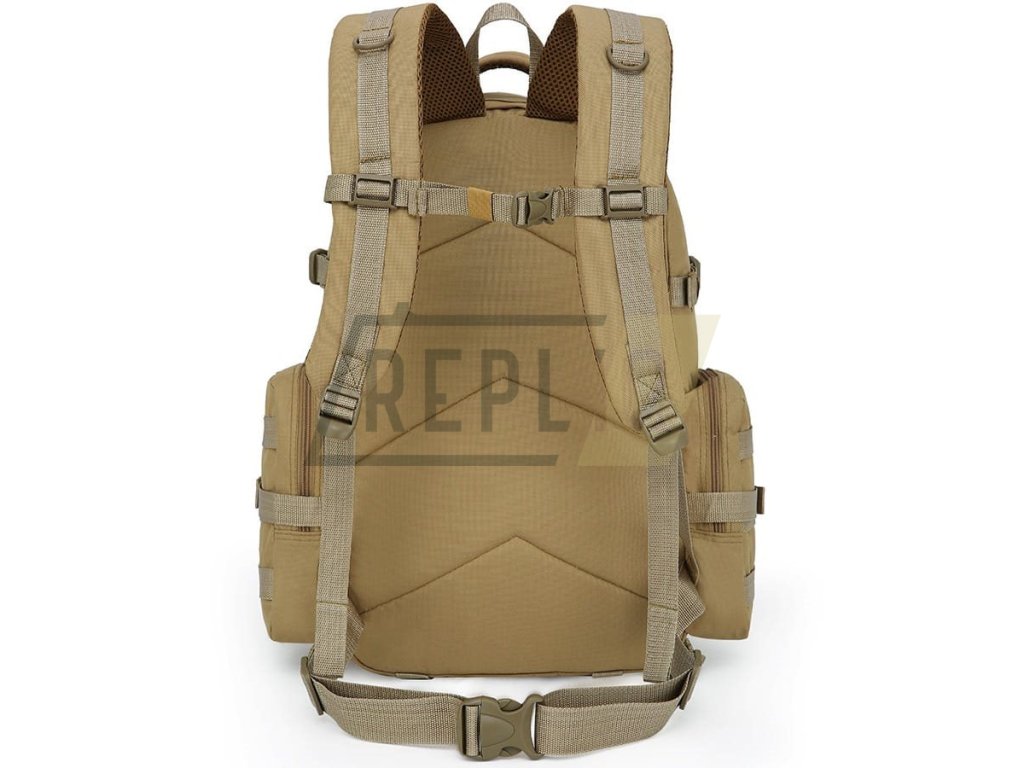 Nastavitelné nosné popruhy jsou lehce zakřivené, bohatě polstrované, opatřené plastovými D kroužky a výškově nastavitelným hrudním popruhem spínaným plastovou přezkou. Záda jsou polstrována měkkou pěnou a v jejich horní části naleznete pohodlné přenášecí madlo. Bederák je šířkově nastavitelný, tvořený jednoduchým popruhem a spínaný plastovou přezkou. Boky jsou opatřené dvěma kompresními popruhy a kapsami na zip, které pojmou i litrovou americkou čutoru. Tyto kapsy jsou navíc pokryté modulární vazbou standardu MOLLE/PALS, která vám umožní připevnit dodatečné kompatibilní vybavení jako jsou sumky, pouzdra apod. Předek batohu je rozdělen na tři samostatné kapsy přístupné skrze dvoucestné zipy. I zde naleznete modulární vazbu, která je v horní části doplněna o pruh suchého zipu určeného pro vaše VELCRO jmenovky a identifikační nášivky. Hlavní úložný prostor se otevírá pomocí dvoucestného zipu a obsahuje několik kapes pro snadnou organizaci výbavy a elastickou přihrádku pro tablet či menší notebook.