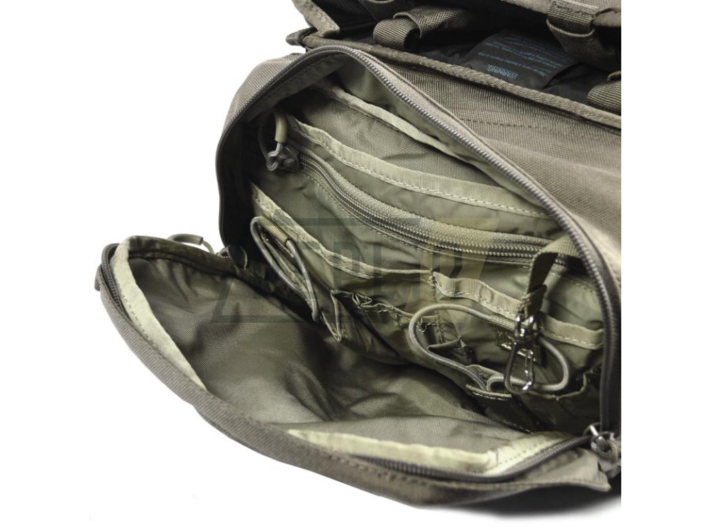 Uvnitř hlavního prostoru najdete další MOLLE vazbu, čtyři ploché přihrádky na čutory či láhve na vodu a dvě přihrádky na dvoulitrové hydratační vaky.
