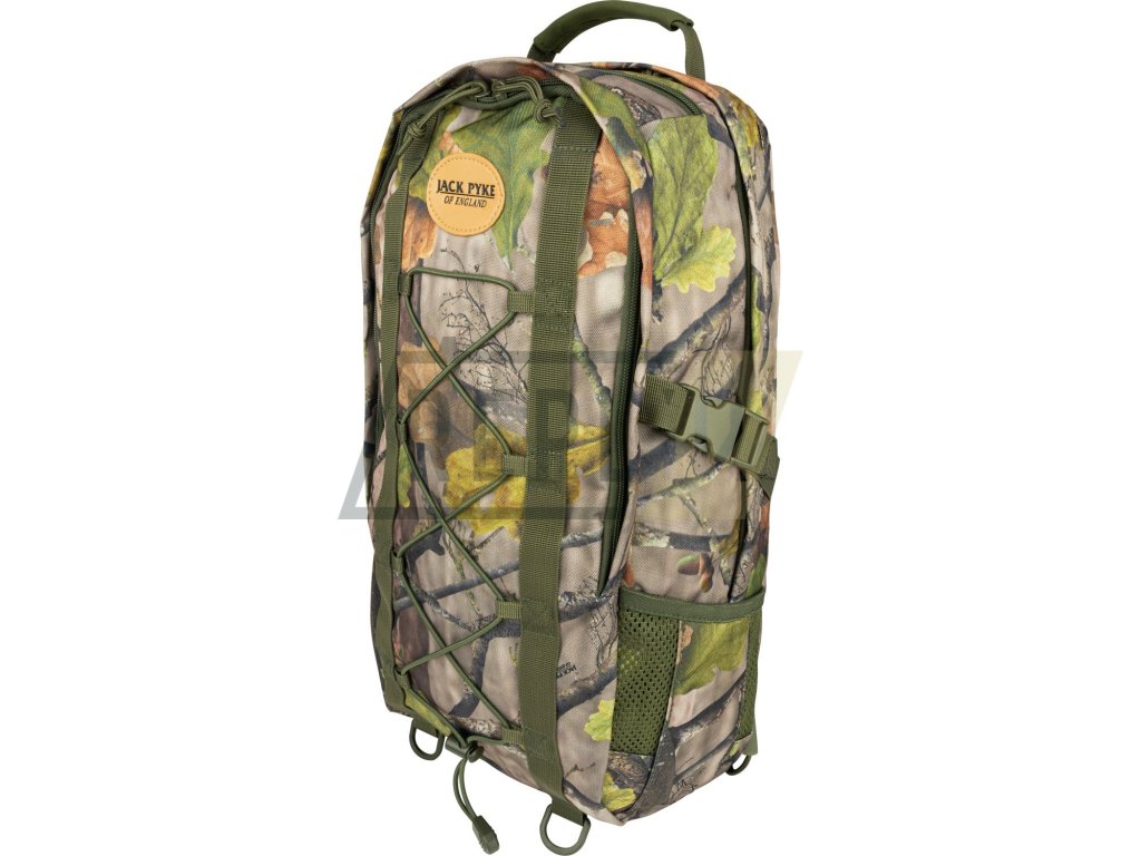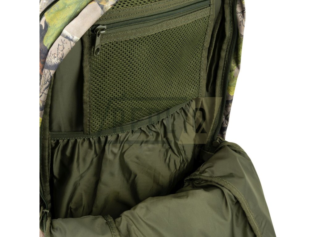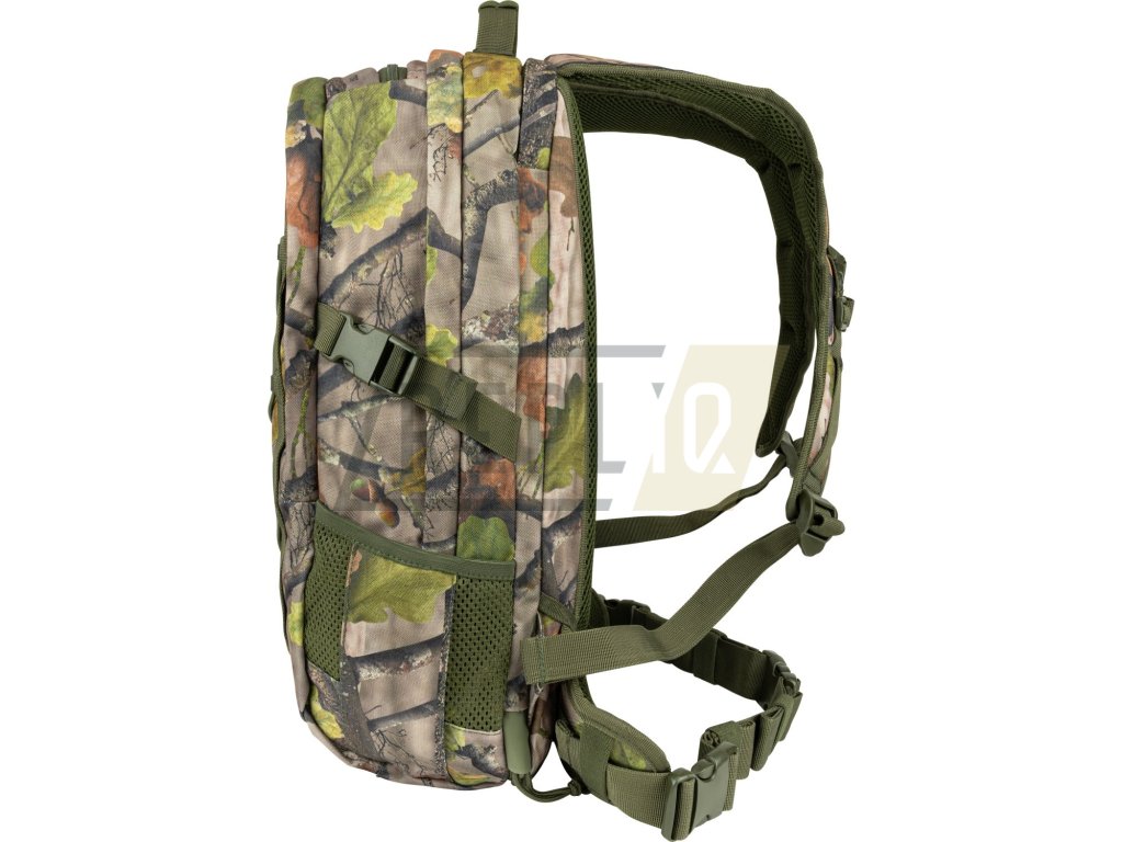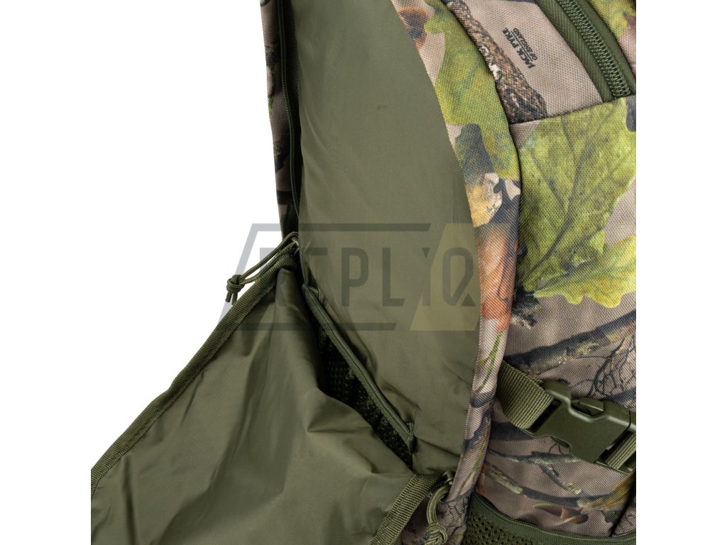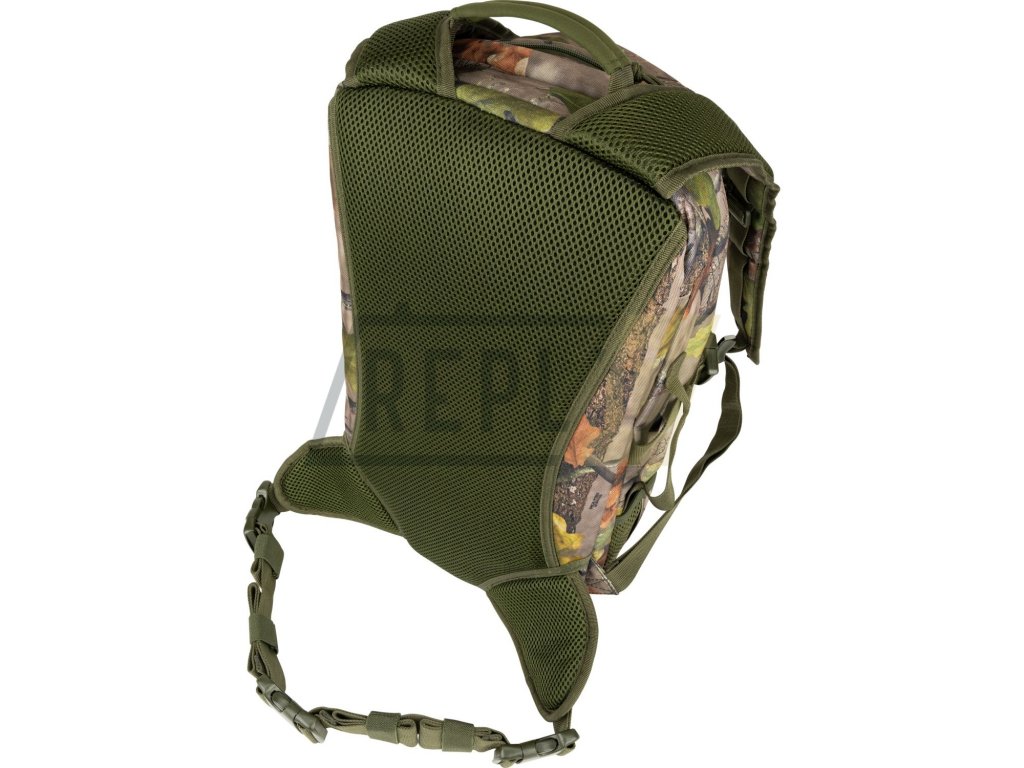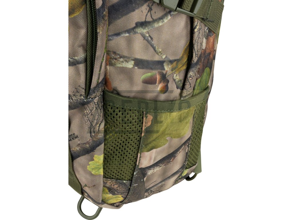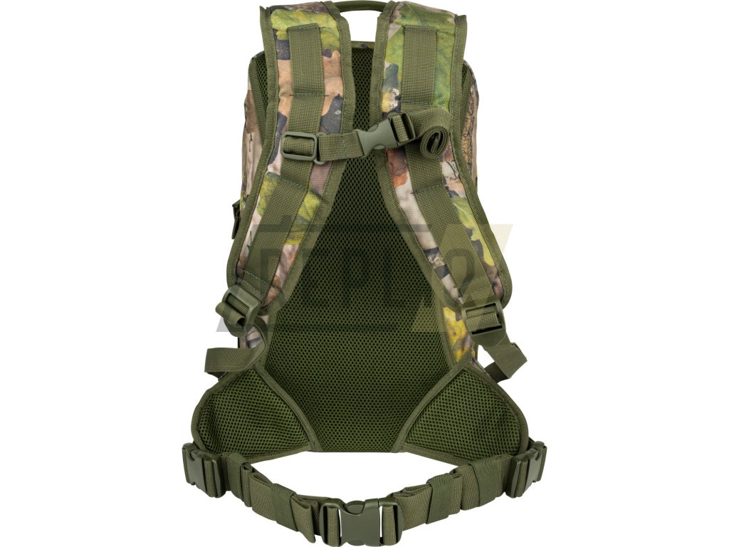 Nosné popruhy batohu jsou anatomicky tvarované, velikostně nastavitelné, polstrované 3D síťovinou a disponují výškově nastavitelným hrudním popruhem. Bederák je odepínatelný, nastavitelný a spínaný pomocí plastové FASTEX přezky. Záda jsou bohatě polstrovaná a nad nimi se nachází přenášecí madlo. Na bocích batohu najdete dvojici částečně síťovaných kapes určených k přenášení láhví na vodu, a dvojici kompresních popruhů spínaných přezkou. Na přední straně batohu naleznete elastickou šňůru, za kterou můžete umístit větrovku a podobnou výbavu. K uložení výbavy slouží dvojice komor zapínaných dvoucestným zipem. Přední komora obsahuje kapsu ze síťoviny, zadní komora je vybavena malou kapsou uzavíranou zipem a elastickou přihrádkou určenou na hydratační vak či tablet. Skládací pouzdro je složené uvnitř batohu a bez problému pojme většinu dlouhých palných zbraní. K připevnění dodatečné výbavy můžete využít plastových D kroužků.