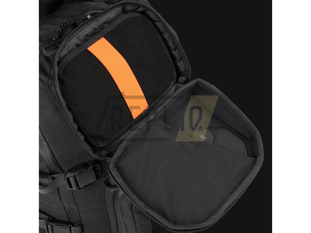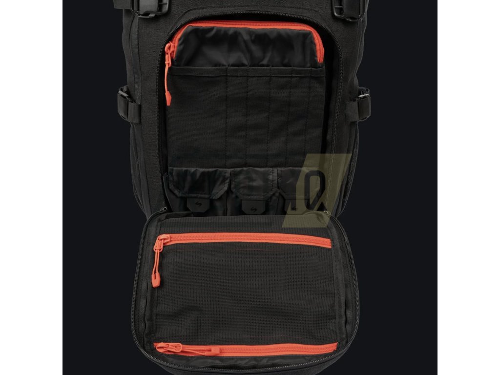 Čelní strana batohu je opatřena dvojicí odsazených kapes přístupných skrze dvoucestné zipy. Vrchní odsazená kapsa je extra zesílená tak aby držela tvar a uvnitř je podšitá jemným flaušem. Spodní odsazená kapsa obsahuje malý organizér, její vnější část je pošita modulární vazbou standardu MOLLE/PALS kombinovanou se suchým zipem. Hlavní komora je přístupná skrze dvoucestný zip. Uvnitř naleznete dvě kapsy ze síťoviny, dva odepínatelné panely s modulární vazbou a silně polstrovanou přihrádku na notebook či hydratační vak. V horní části hlavní komory se nachází průchodky pro kabeláž či hadičku hydratačního vaku.