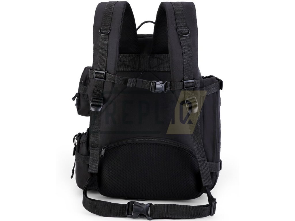 Délkově nastavitelné nosné popruhy batohu jsou silně polstrované pomocí 3D síťoviny, disponují stabilizačními popruhy, plastovými D kroužky a hrudním popruhem spínaným plastovou přezkou. Záda jsou v bedrech polstrována a bederák je tvořen jednoduchým popruhem s přezkou. Horní část batohu je opatřena jednoduchým přenášecím madlem a otvorem na provlečení hadičky hydratačního vaku. Na bocích najdete dvojici kompresních popruhů a celkem tři kapsy vhodné na uložení drobnější výbavy. V přední části se nachází dvojice kapes. Spodní kapsa je z vnější strany pošita modulární vazbou kombinovanou s panely suchého zipu pro vaše VELCRO nášivky, uvnitř je rozdělovač s menšími přihrádkami a šňůrou s plastovou karabinkou. Horní kapsa je také pošita MOLLE/PALS vazbou se suchým zipem, interiér kapsy je ale bez členění. Hlavní úložný prostor obsahuje elastickou přihrádku pro hydratační vak či menší tablet/notebook a malou přední kapsu ze síťoviny. Dno batohu je pošito další modulární vazbou.