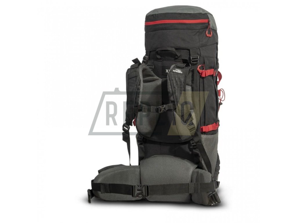 Zádový systém je výškově nastavitelný a vyznačuje se masivním a prodyšným polstrováním, které oceníte především při nošení opravdu těžkých nákladů. Ramenní popruhy jsou anatomicky zakřivené, délkově stavitelné a opatřené výškově stavitelným hrudním popruhem s plastovou přezkou. Bederák je opatřený praktickou kapsou na drobnější vybavení a spíná se pomocí přezky. Boky jsou opatřené kompresními popruhy a kapsami ze síťoviny. Víko krosny je výškově stavitelné a opatřené poměrně rozměrnou kapsou. Batoh lze plnit skrze horní a spodní plnění, uvnitř hlavní komory naleznete přepážku stáhnutelnou pomocí šňůry s brzdičkou. Přední batoh je fixován pomocí zipu, disponuje vlastními nosnými popruhy a dvěma menšími komorami.