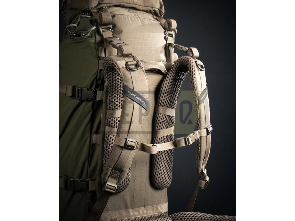 Hliníkový nosný systém je tvarovaný pro maximální oporu zad. V případě potřeby je možné batoh celý odejmout a zádový systém používat samostatně, či v kombinaci s dalším kompatibilním příslušenstvím z produktové řady EMOD HUNT od značky EBERLESTOCK. Ramenní popruhy jsou opatřené stabilizačními dorazy, elastickým hrudním popruhem a je možné je výškově nastavit dle potřeb uživatele. Bederák disponuje opravdu masivním polštářkem pokrytým silikonem, který zabraňuje nechtěnému klouzání batohu při dynamickém pohybu. Boky bederáku jsou také silně polstrované a spínají se pomocí robustní plastové přezky.