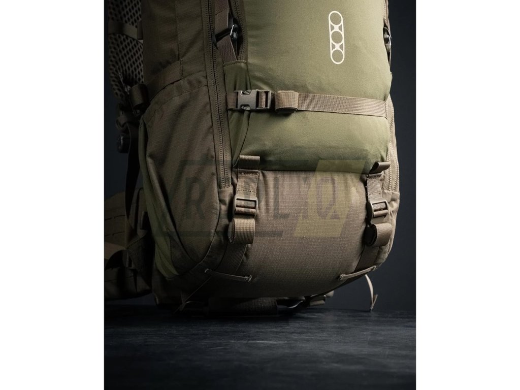 Boky batohu jsou asymetrické. Jedna strana je opatřena z části elastickou kapsou na láhve, na druhé straně naleznete podlouhlou elastickou kapsu přístupnou skrze dvoucestný zip. Na obou bocích jsou napevno připevněné kompresní popruhy. Čelní část je opatřena rozměrnou elastickou kapsou a další dvojicí kompresních popruhů. Vrchní kapsa u vstupu je vhodná především pro nutnou výbavu, kterou chcete mít stále při ruce. Hlavní vstup do interiéru batohu je pak krytý odnímatelným víkem s dvojicí kapes a poměrně rozměrným VELCRO panelem pro personalizaci pomocí nášivek se suchým zipem.