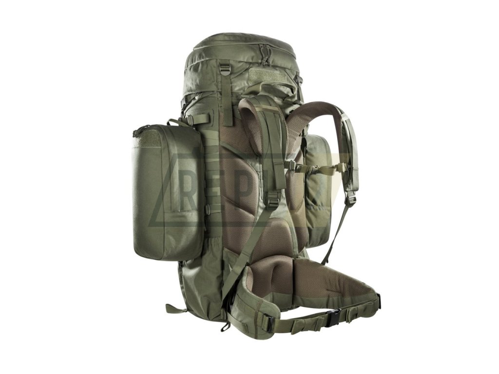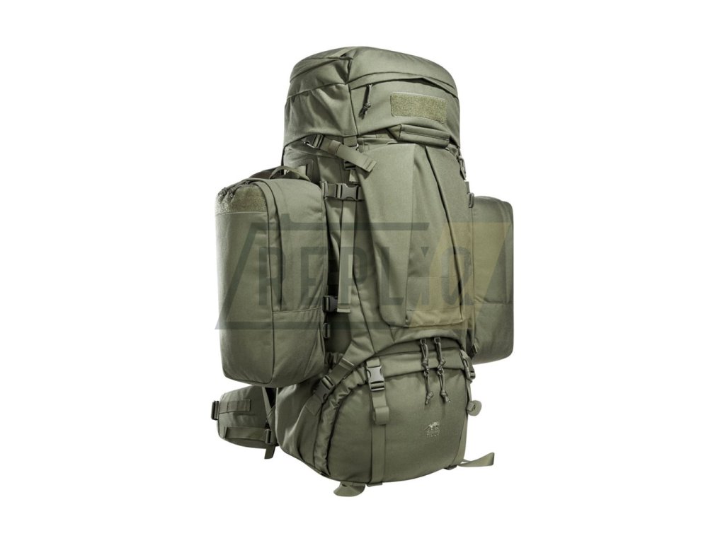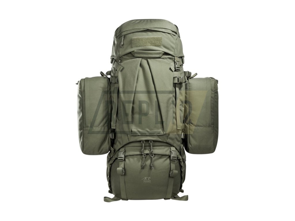 Velký vojenský batoh s horním a dvěma čelními vstupy, pohodlným nosným systémem, odnímatelnými vnějšími kapsami a modulární vazbou.