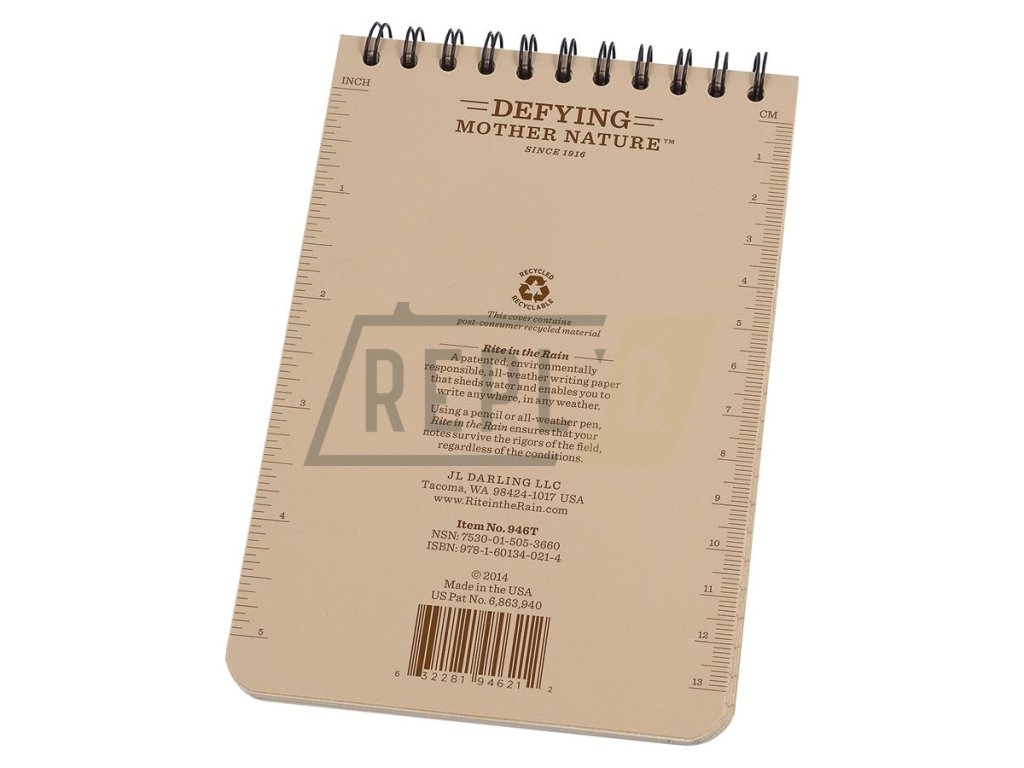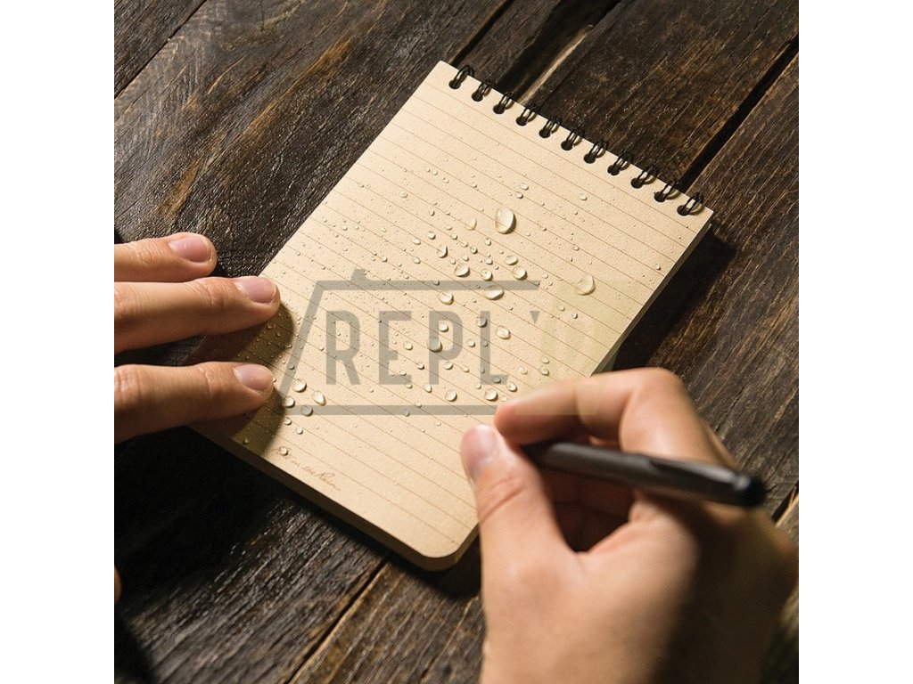 Nepromokavý linkovaný zápisník v kroužkové vazbě. Rozměr 165 x 105 mm. 50 listů. Součástí bloku převody jednotek imperiálního a metrického systému, mapová měřítka. Vyrobeno v USA.