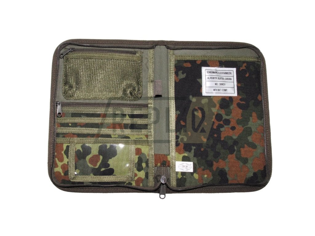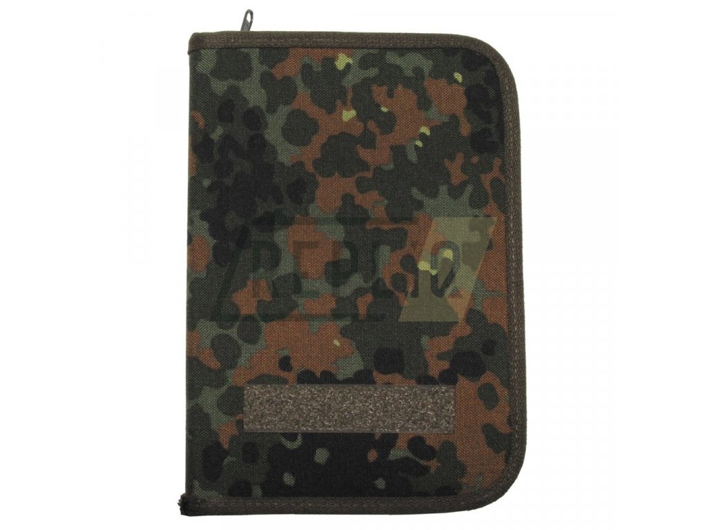 Pouzdro na dokumenty. V levé části 2 kapsičky na zip (jedna síťovaná), sloty na karty, poutko na tužku. V pravé části kapsa na blok A5. Zapínání na zip po celém obvodu, z vnější strany proužek se suchým zipem. Materiál: nylon.