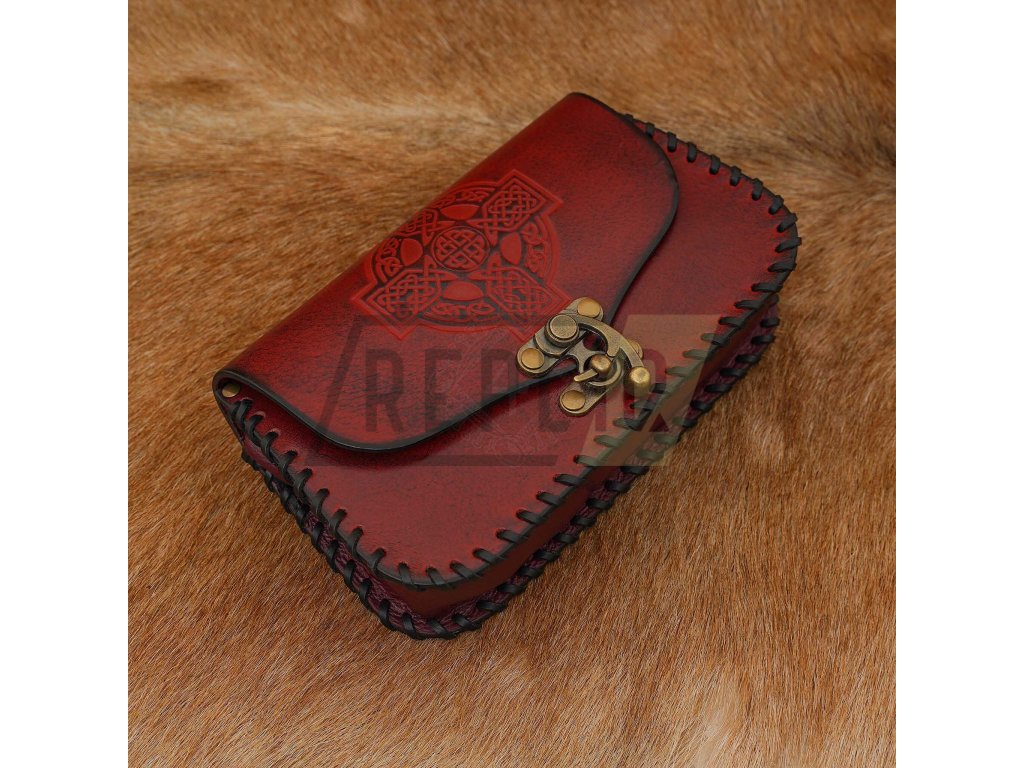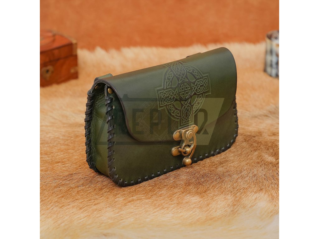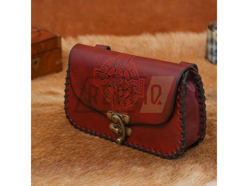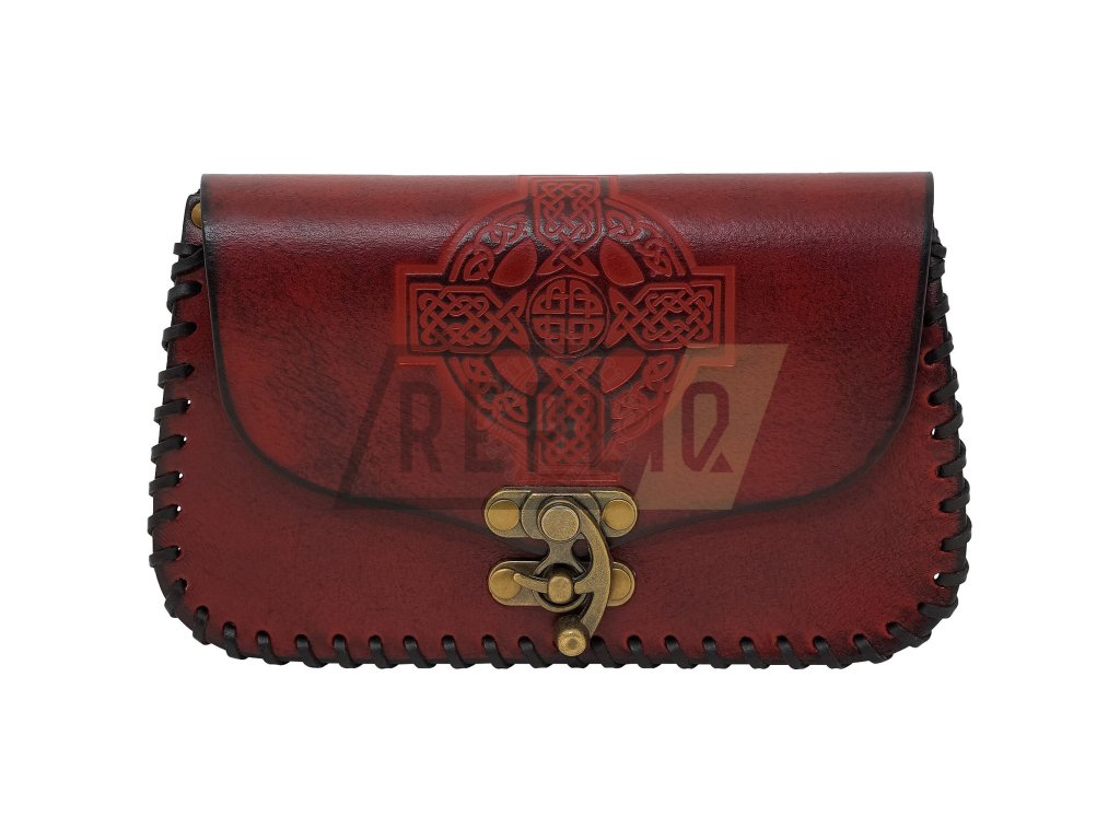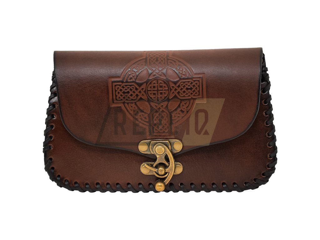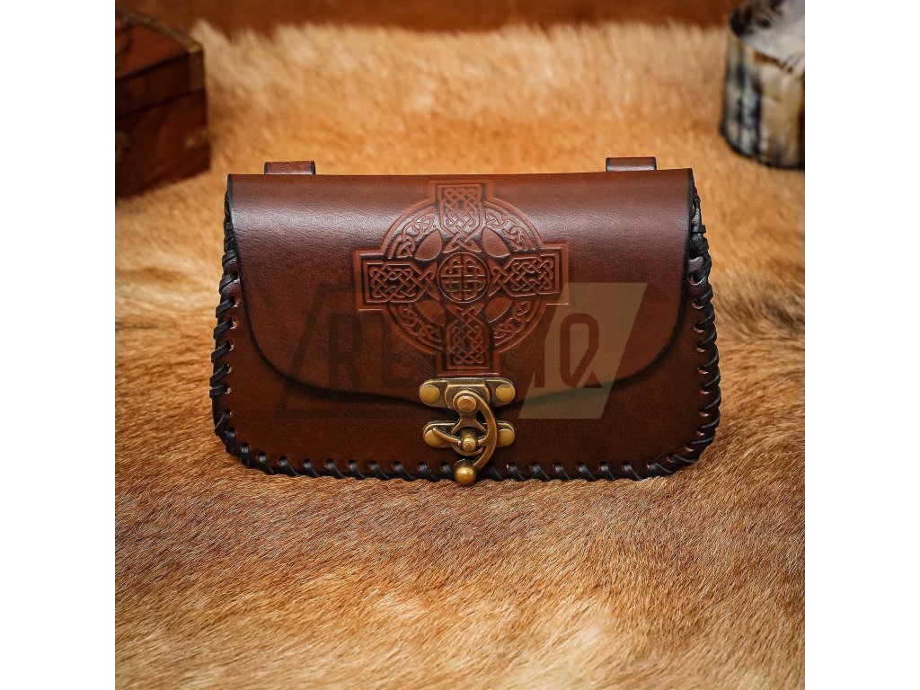 Brašna na opasek s ražbou keltského kříže a háčkovou přezkouOkraje brašny jsou lemované koženou šňůrkou pro větší odolnost.