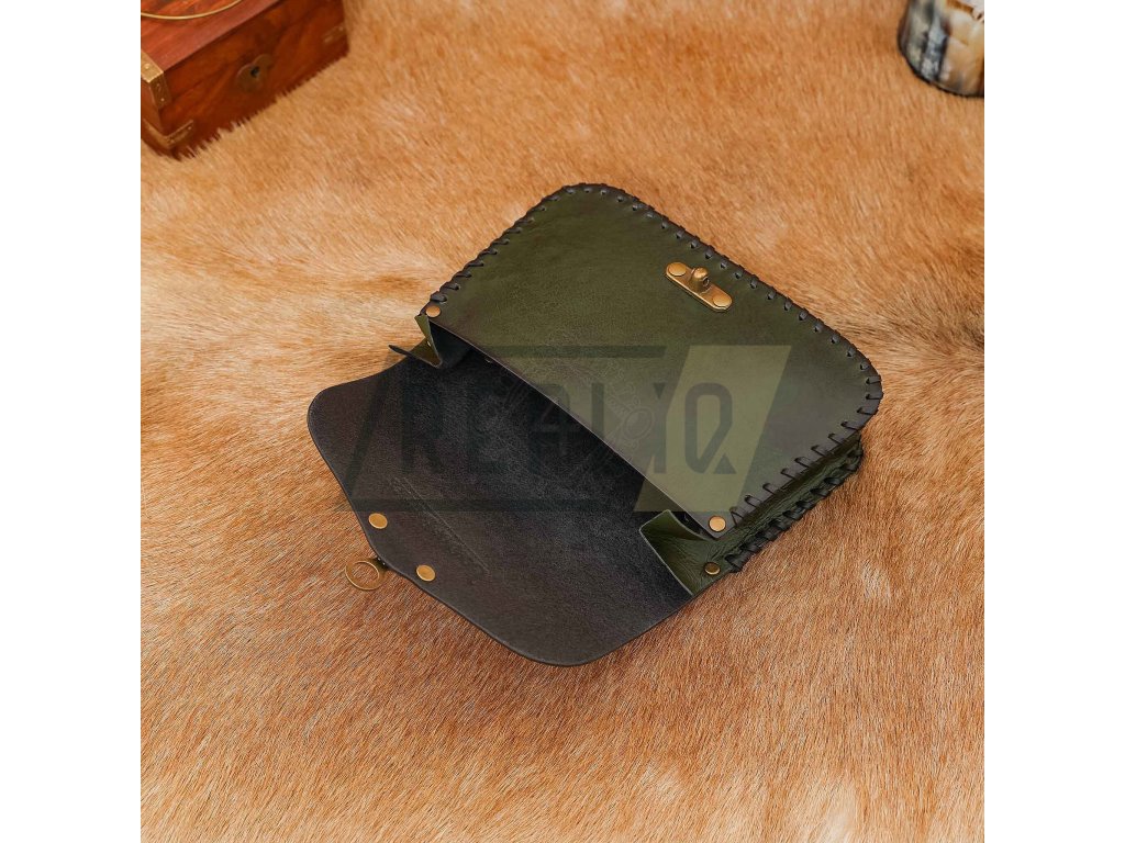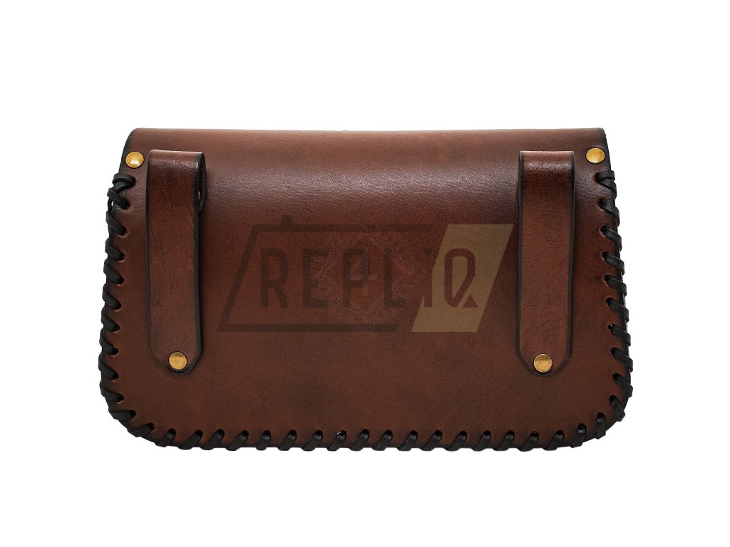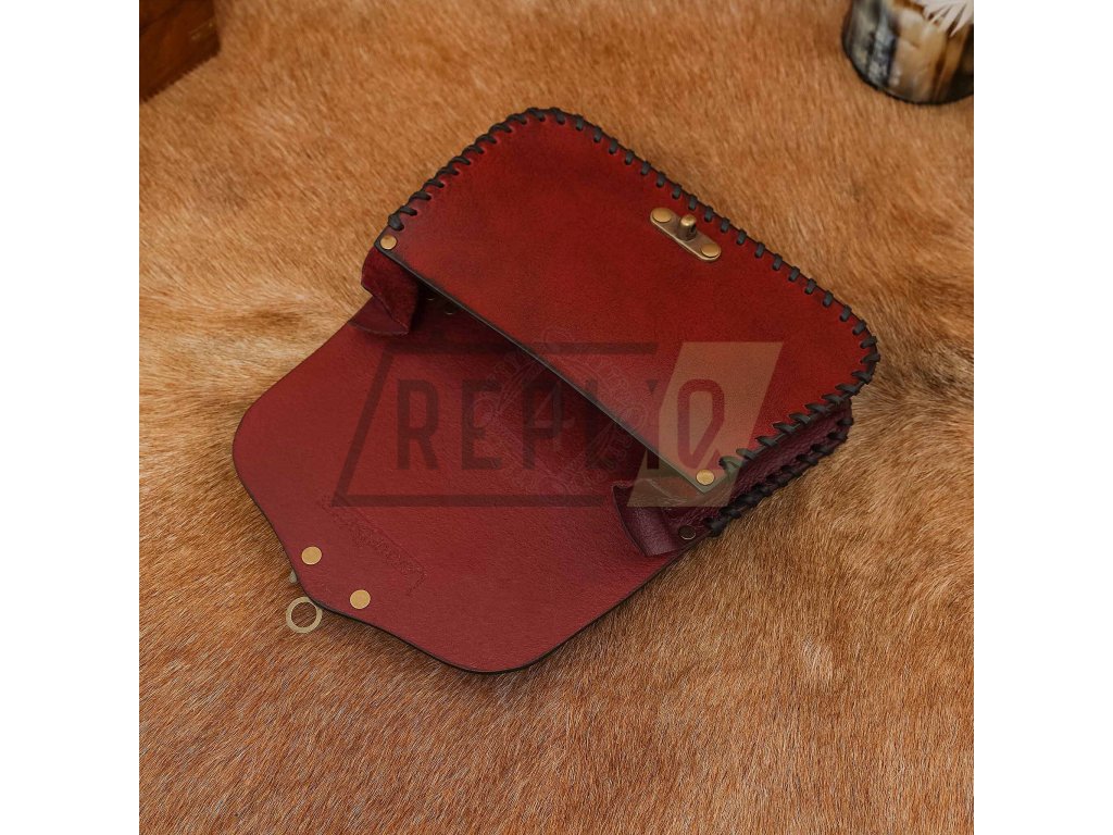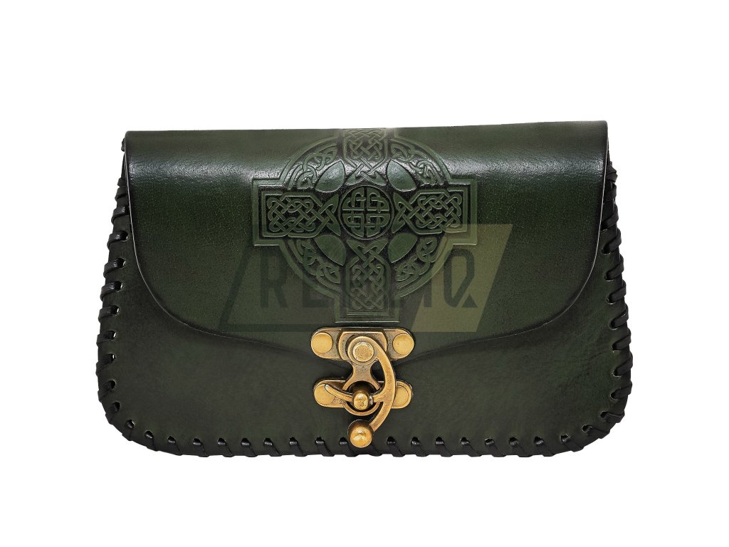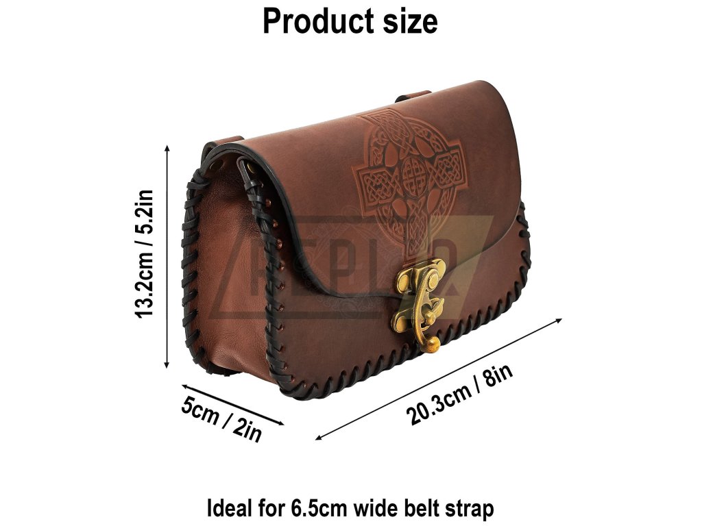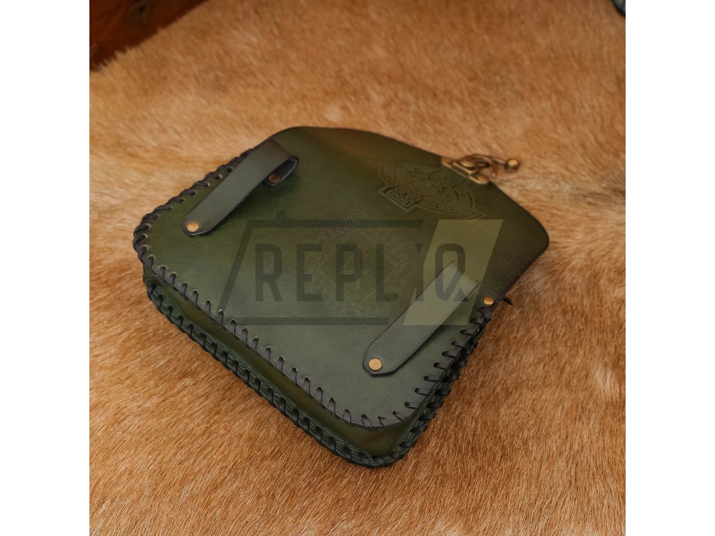 Brašna na opasek s ražbou keltského kříže a háčkovou přezkouOkraje brašny jsou lemované koženou šňůrkou pro větší odolnost.