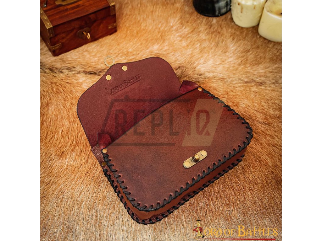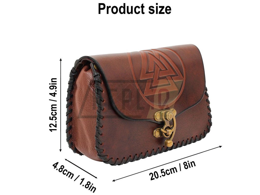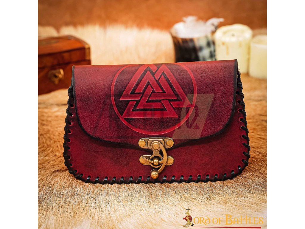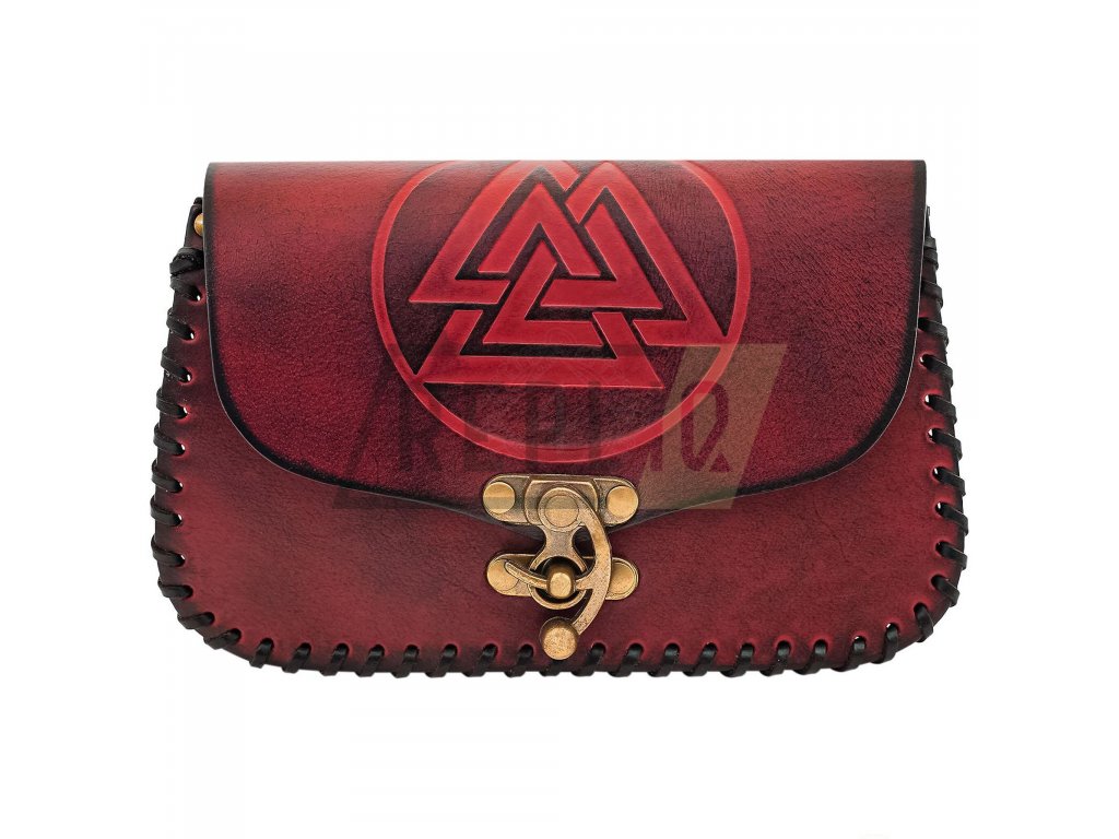 Germánská opasková brašna s vyraženým symbolem Valknut a háčkovou sponouOkraje brašny jsou pro větší odolnost olemovány koženou šňůrkou