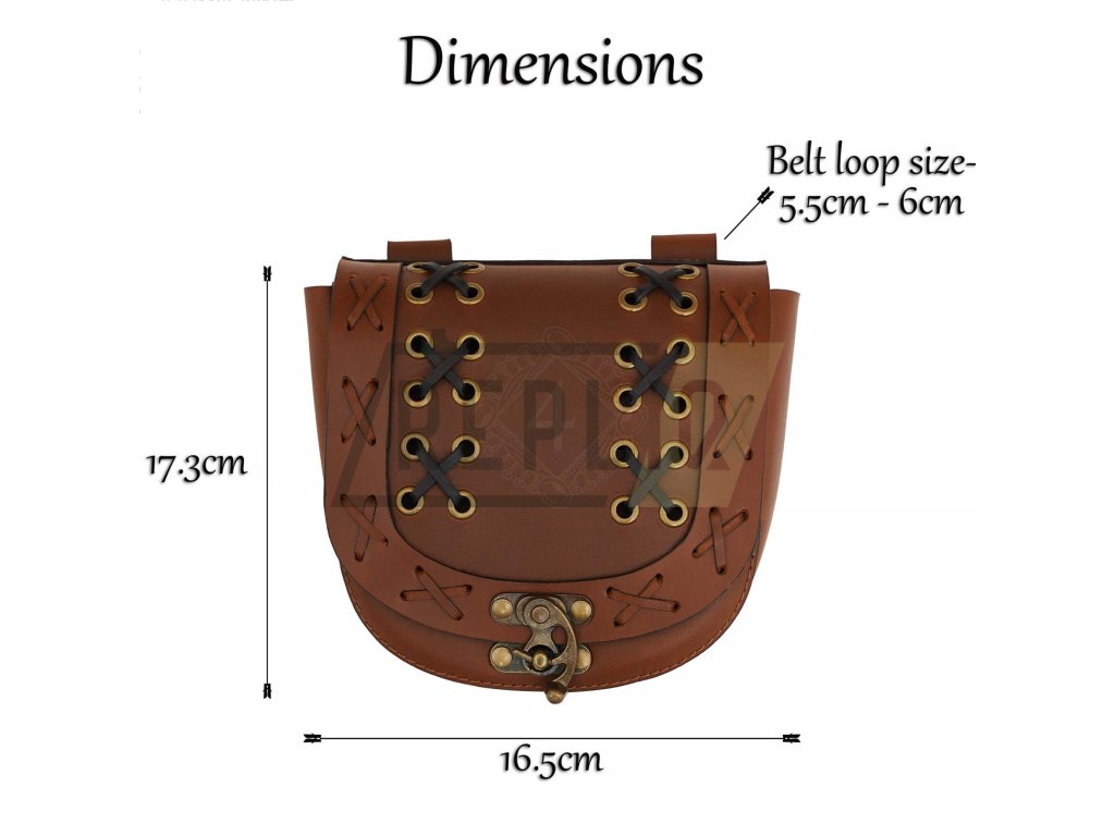 Tato středověká brašna na opasek, ručně zhotovená z kvalitní pravé kůže o tloušťce 2,5 mm, je neocenitelným doplňkem pro každého milovníka historie a fantasy. Její design okamžitě upoutá pozornost díky bohatému křížovému šněrování, které pokrývá přední stranu a klopu. Šněrování je navlečeno do pevných mosazných průchodek, což zajišťuje jeho stabilitu a odolnost. Celá brašna se bezpečně uzavírá stylovou přezkou z mosazi s patinou, která dává výrobku autentický historický vzhled.