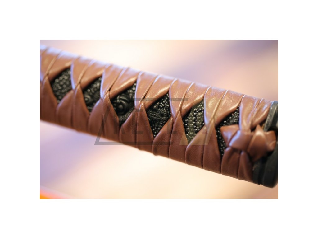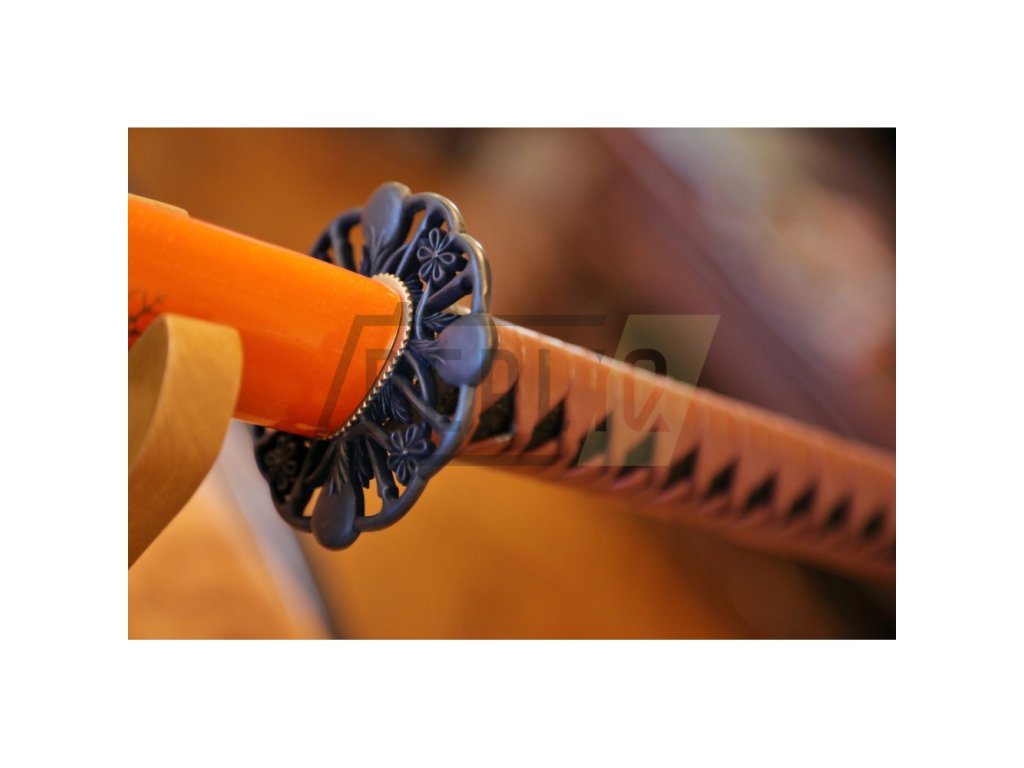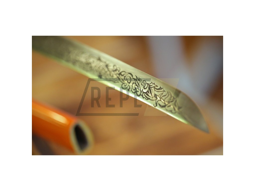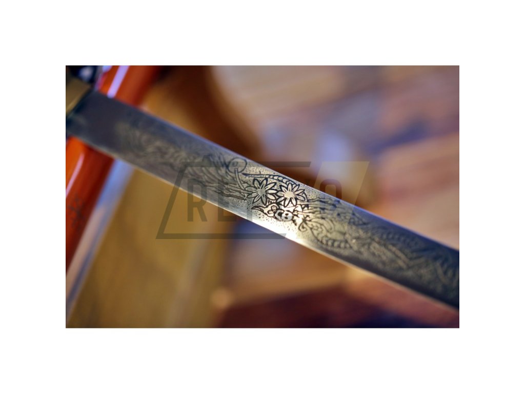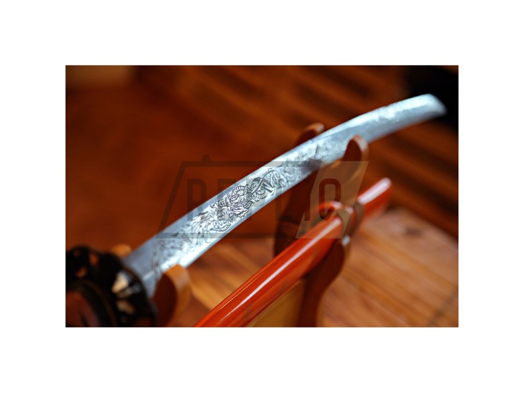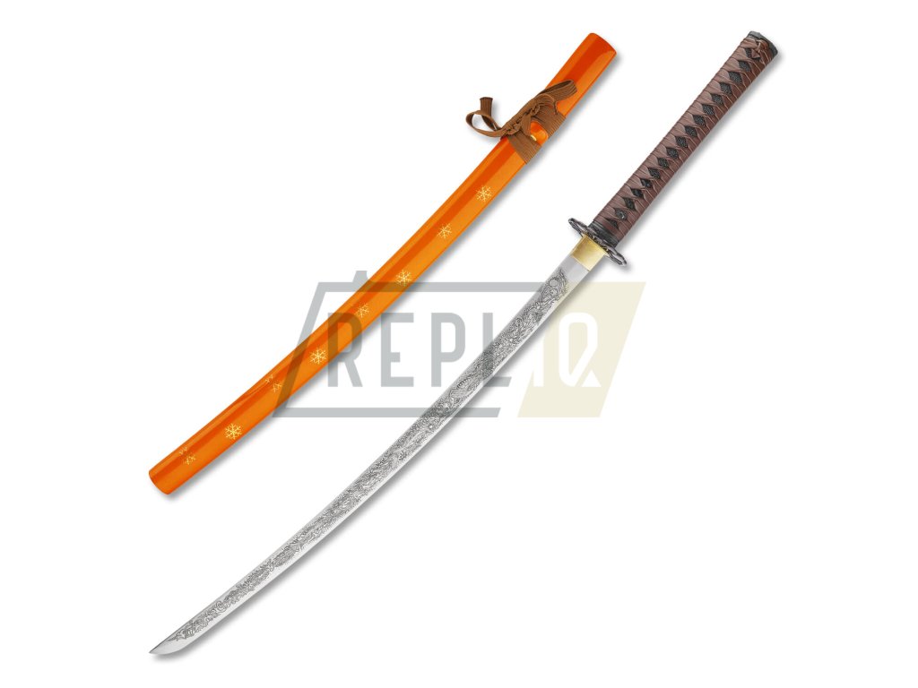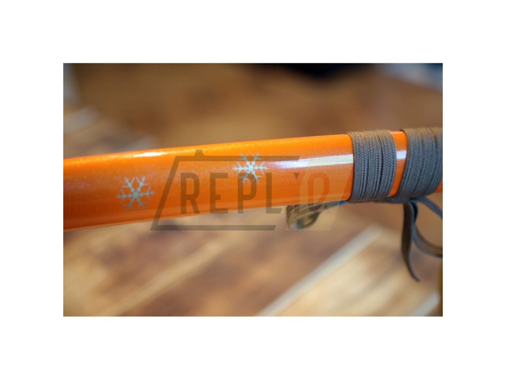 Kovaná replika meče katana s čepelí z uhlíkové oceli AISI 1045 s kresbou Horimono. Ostrý (broušený) samurajský meč katana najde své uplatnění jako dekorace, ale i k aktivnímu nácviku bojového umění. Katana není zcela vhodná k sekání tvrdších materiálů. Ocel není parciálně zakalena a proto má nízký stupeň tvrdosti. Sekání tvrdých materiálů by zanechalo stopy na ostří meče. Atraktivní a ostrá čepel, oranžová saya se sněhovými vločkami plus tsuka (rukojeť), která je potažena černou rejnočí kůží s hnědým koženým opletem, to vše dělá tuto katanu velmi zajímavou a žádanou. Katana je uložena v plátěném vaku a papírové krabici. Ostří katany zdobí kresba horimono. Firma Dellinger se zříká jakékoliv odpovědnosti za zranění a poškození vzniklá při použití. Schraňujte meč mimo dosah dětí! Jakákoliv manipulace se samurajským mečem je na vaší vlastní odpovědnost. Nezapomeňte, že máte ve svých rukou smrtelnou zbraň!