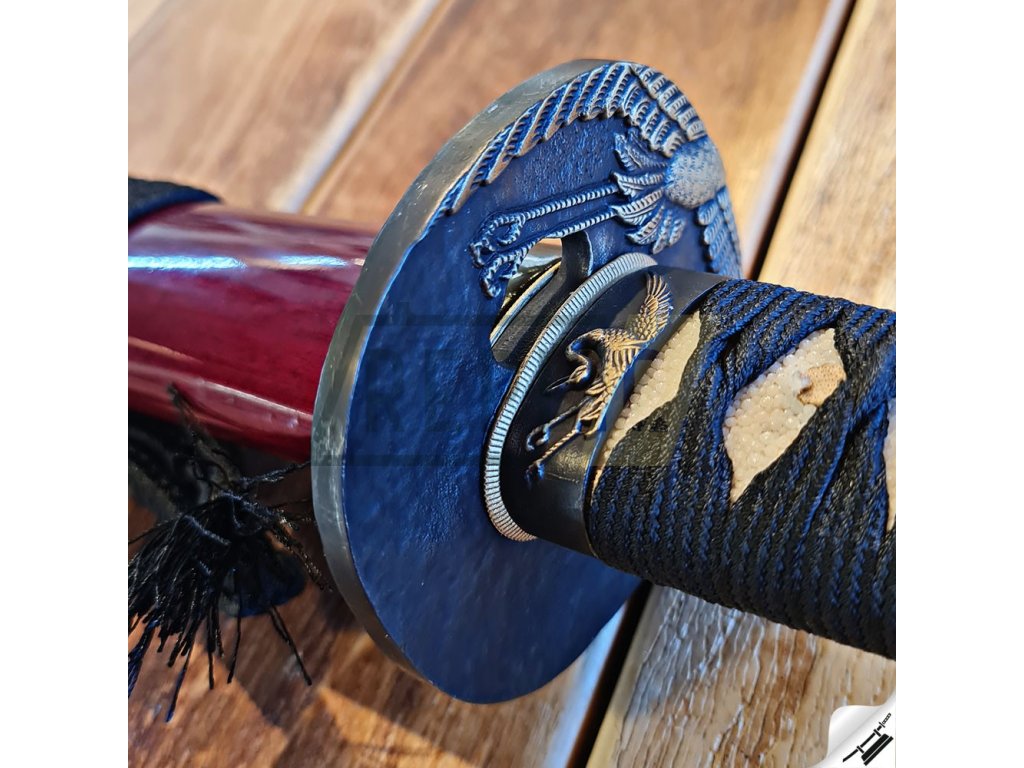 Funkční replika meče katana s reálným hamonem Choji. Ostrý meč katana najde své uplatnění jako dekorace, ale i k aktivnímu nácviku bojového umění. Ocel je parciálně zakalena a proto má stupeň tvrdosti 52 HRC. Atraktivní a ostrá čepel, vínová lesklá saya s květinovou kresbou plus tsuka (rukojeť), která je potažena pravou rejnočí kůží, to vše dělá tuto katanu velmi zajímavou a žádanou. Katana je uložena v plátěném vaku a papírové krabici. Ostří katany zdobí reálný hamon Choji. Společnost Dellinger se zříká jakékoliv odpovědnosti za zranění a poškození vzniklá při použití. Schraňujte meč mimo dosah dětí. Jakákoliv manipulace s mečem je na vaši vlastní odpovědnost. Nezapomeňte, že máte ve svých rukou smrtelnou zbraň.