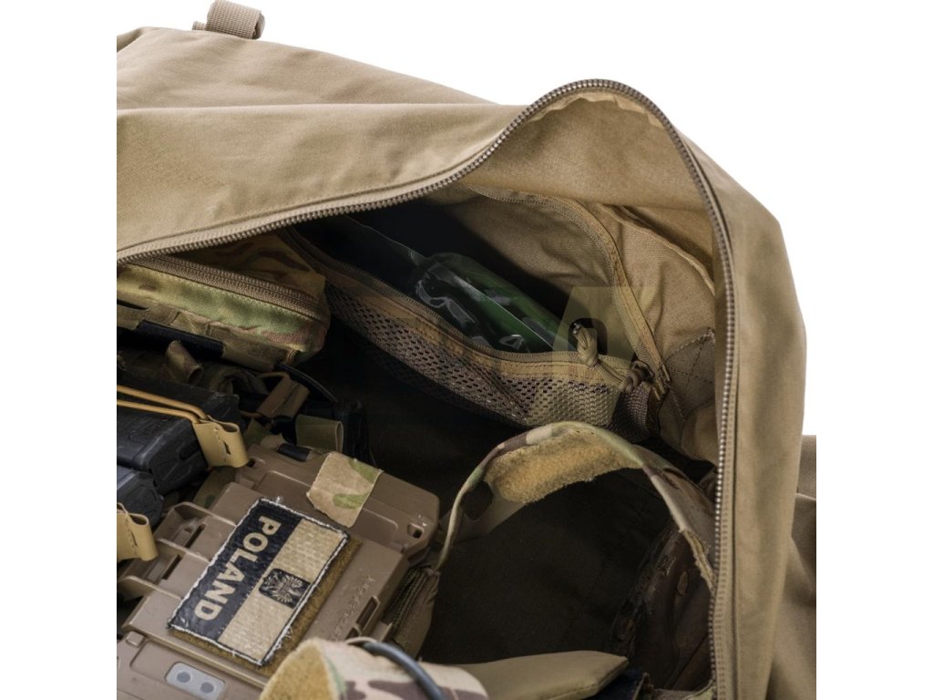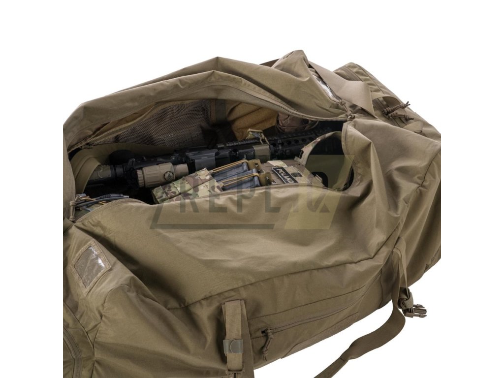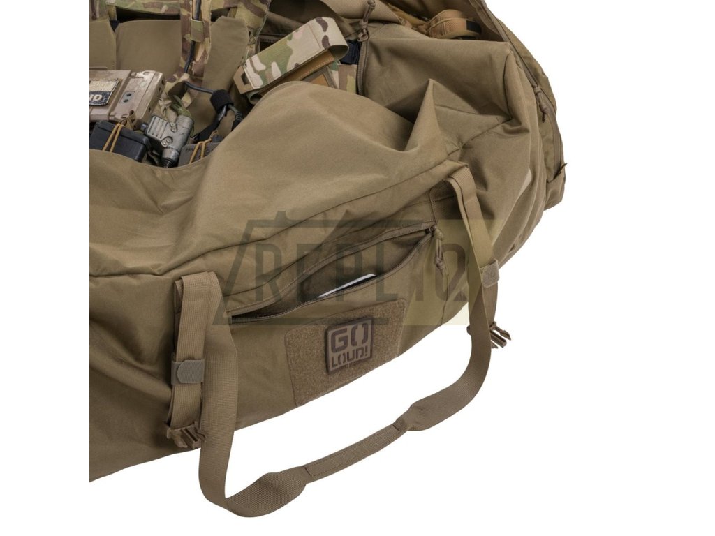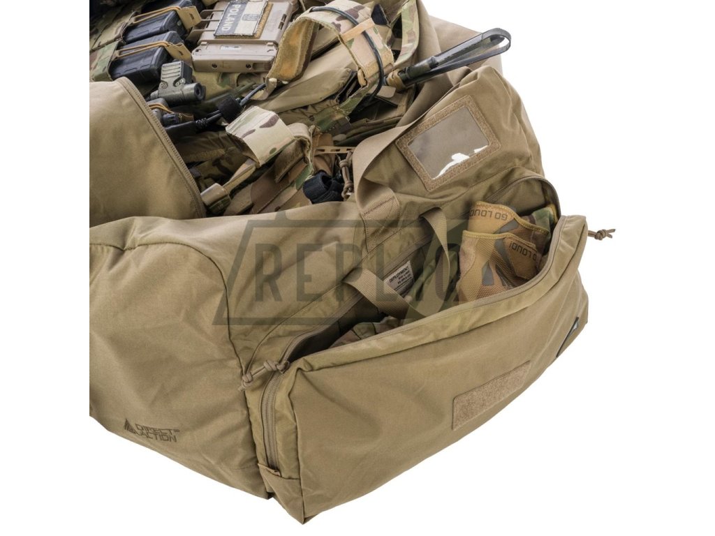 Velká cestovní taška perfektní na dlouhé přesuny. Je vyrobená z odolné 500D Cordury nabízející skvělý poměr mezi váhou a odolností. K jejímu přenášení můžete využít délkově nastavitelného ramenního popruhu a klasického středového madla, které je pevně zašité do konstrukce tašky a nehrozí tak jeho odtržení ani při přenášení velmi těžké výbavy. Na jedné straně tašky naleznete plochou kapsu přístupnou skrze horizontální zip. Ta je vhodná pro dokumenty do velikosti A4. Na této kapse také naleznete našitý VELRO panel pro vaše jmenovky a nášivky na suchý zip. Čelní a zadní strana také disponuje slídovými okénky pro jmenovky a personalizaci. Boky jsou opatřeny kapsami přístupnými skrze zip nad nimi naleznete menší přenášecí madla. Hlavní úložný prostor je přístupný skrze dvoucestný středový YKK zip opatřený hmatníky. Uvnitř se nachází dvojice kapes ze síťoviny, které se dají rychle a snadno uzavřít pomocí zipu. Při nepoužívání se dá taška rychle sbalit do kompaktních rozměrů.