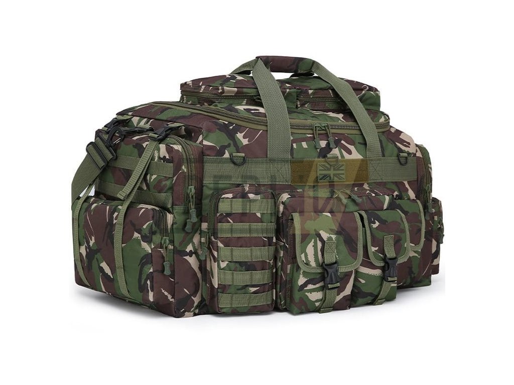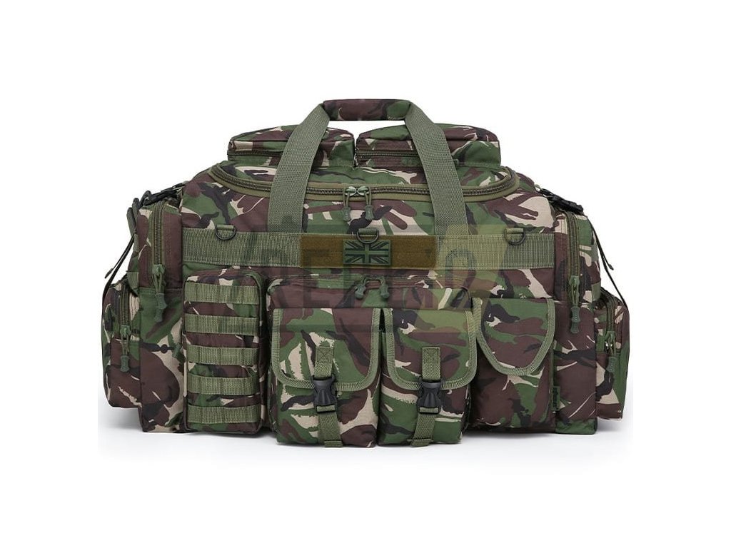 Na přední straně je celkem 5 kapes - plochá kapsa na zip, na které jsou umístěné dvě kapsy s klopou s plastovou přezkou. Na pravé pohledové straně je kapsa se suchým zipem, na levé je kapsa na zip, která má na vnější straně pět popruhů MOLLE vazby. Pokud by bylo potřeba, můžete na ni připnout další drobnější vybavení s MOLLE/PALS vazbou. Uprostřed nad kapsami je pruh suchého zipu s nášivkou britské vlajky a tři plastové D kroužky.