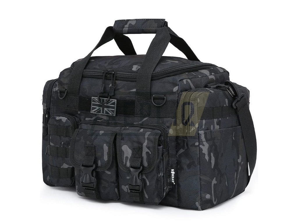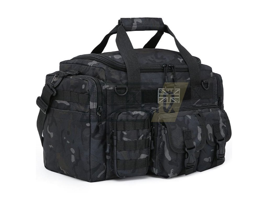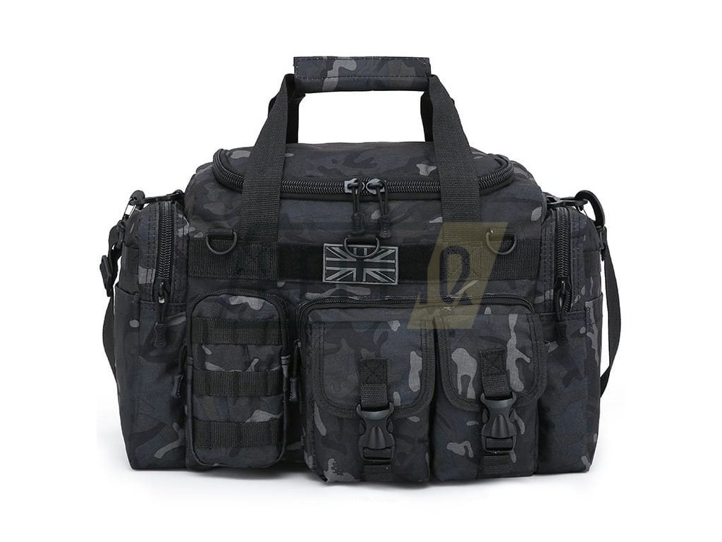 Na přední straně jsou celkem 4 kapsy - plochá kapsa na zip, na které jsou umístěné dvě kapsy s klopou s plastovou přezkou. Na levé pohledové straně je kapsa na zip, která má na vnější straně pět popruhů MOLLE vazby. Pokud by bylo potřeba, můžete na ni připnout další drobnější vybavení s MOLLE/PALS vazbou. Uprostřed nad kapsami je pruh suchého zipu s nášivkou britské vlajky a tři plastové D kroužky.