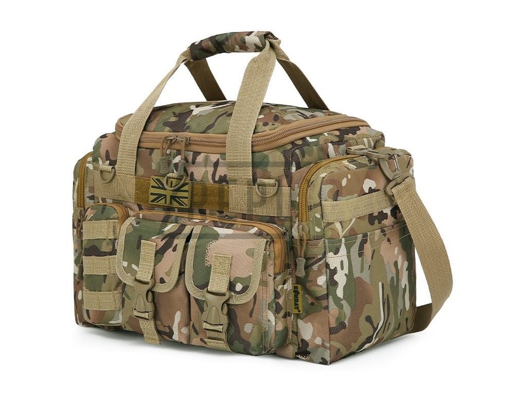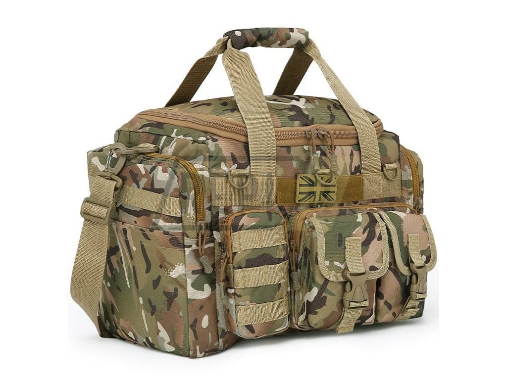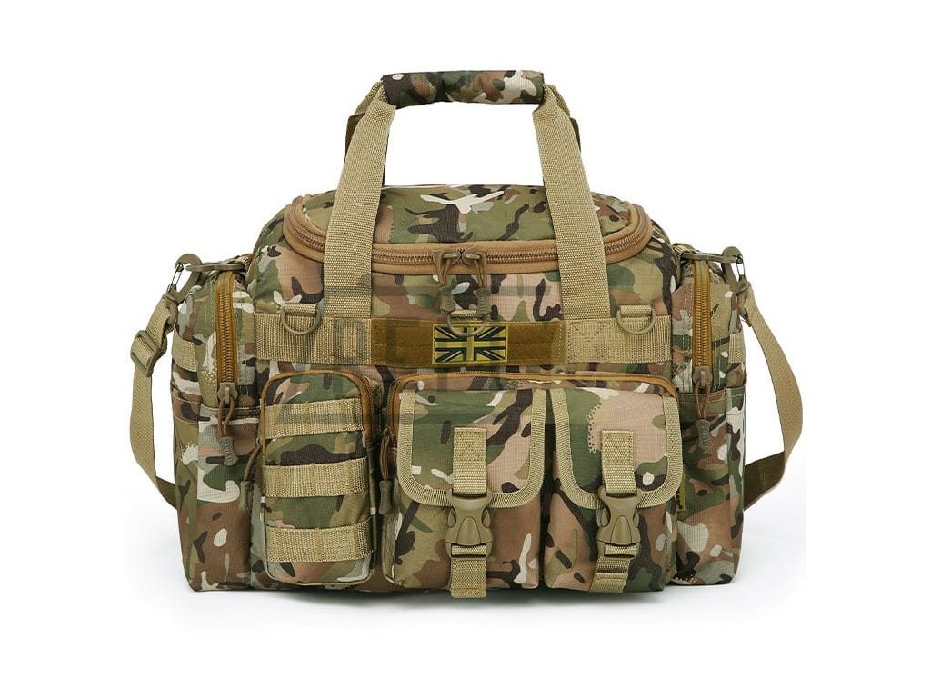 Na přední straně jsou celkem 4 kapsy - plochá kapsa na zip, na které jsou umístěné dvě kapsy s klopou s plastovou přezkou. Na levé pohledové straně je kapsa na zip, která má na vnější straně pět popruhů MOLLE vazby. Pokud by bylo potřeba, můžete na ni připnout další drobnější vybavení s MOLLE/PALS vazbou. Uprostřed nad kapsami je pruh suchého zipu s nášivkou britské vlajky a tři plastové D kroužky.