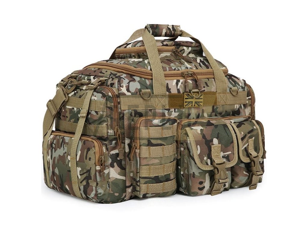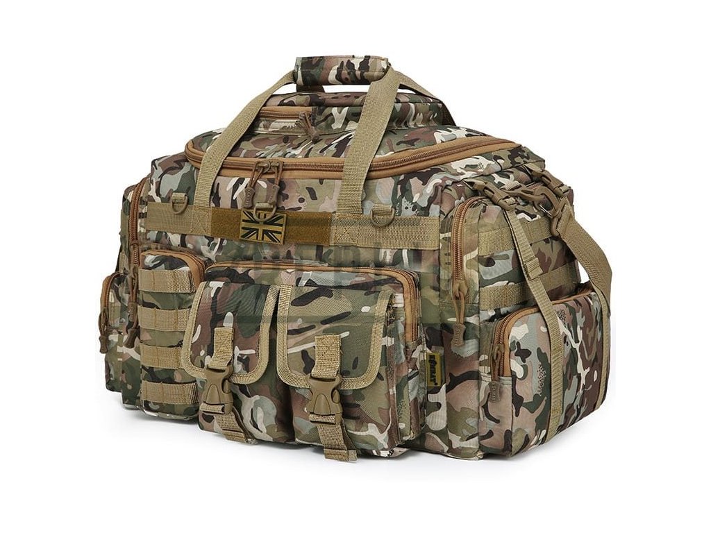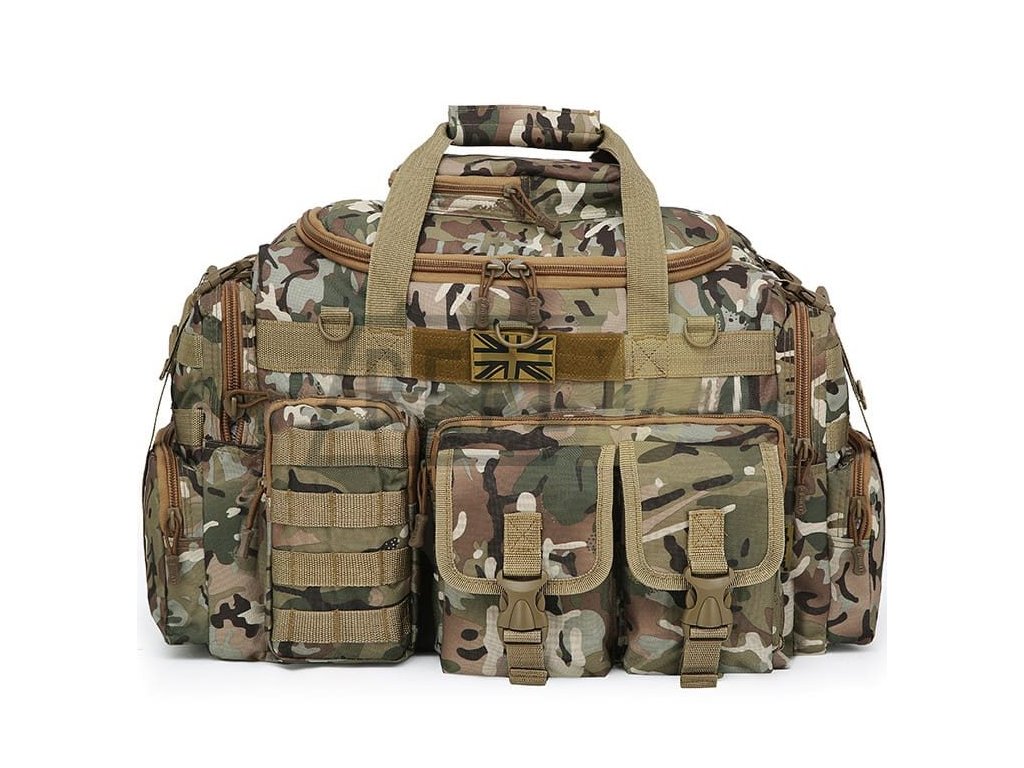 Na přední straně jsou celkem 4 kapsy - plochá kapsa na zip, na které jsou umístěné dvě kapsy s klopou s plastovou přezkou. Na levé pohledové straně je kapsa na zip, která má na vnější straně pět popruhů MOLLE vazby. Pokud by bylo potřeba, můžete na ni připnout další drobnější vybavení s MOLLE/PALS vazbou. Uprostřed nad kapsami je pruh suchého zipu s nášivkou britské vlajky a tři plastové D kroužky.