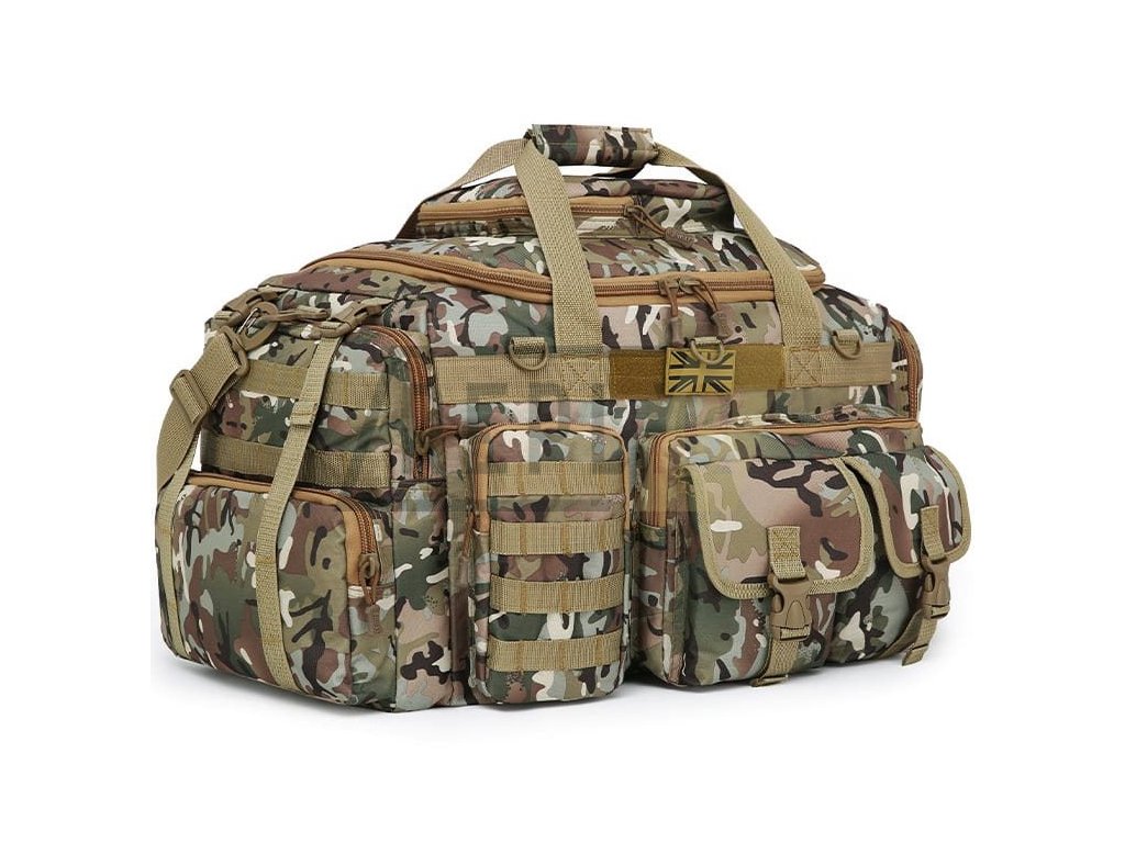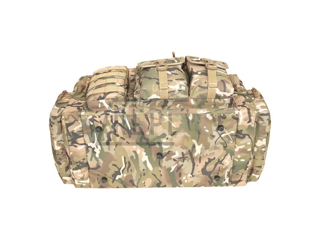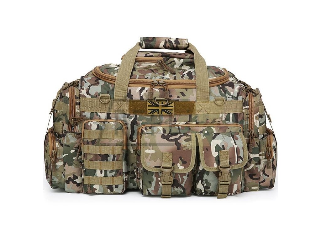 Na přední straně jsou celkem 4 kapsy - plochá kapsa na zip, na které jsou umístěné dvě kapsy s klopou s plastovou přezkou. Na levé pohledové straně je kapsa na zip, která má na vnější straně pět popruhů MOLLE vazby. Pokud by bylo potřeba, můžete na ni připnout další drobnější vybavení s MOLLE/PALS vazbou. Uprostřed nad kapsami je pruh suchého zipu s nášivkou britské vlajky a tři plastové D kroužky.