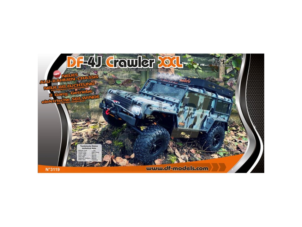 DF-4J XXL Crawler je nyní vybaven již v základu hliníkovými výztuhami pro maximální pevnost. Oproti předchůdci má také ve standardu směrová a brzdová světla. Dále je vybaven stejnosměrným 60-ti závitovým motorem a s vysokým točivým momentem. Model má super měkké pneumatiky, díky kterým perfektně doslova obejme každou překážku. Diferenciály modelu jsou uzavřené a speciální elektronický regulátor typu crawler, má funkci zastavení při sjíždění ze svahu. Úhel nájezdu na překážku je až 90%, v závislosti na terénu. Elektronika je v modelu chráněna proti stříkající vodě, takže vlhkost není problém. Pevné nápravy, hliníkový rám, extrémní odpružení a mnohem více nabízejí nové modely řady DF-4J XXL! Vstupte do velkého světa "pomalých" vozidel! Model lze vylepšit řadou dalších vychytávek, jako je řízení všech čtyř kol, či tuningovými ALU hliníkovými díly. S modelem lze dosáhnout doby jízdy přes 60 minut. Převodové stupně (řazení) lze ovládat z vysílače. Vysílač má možnost díky funkci dual rate nastavit maximální rychlost 0-100%.
