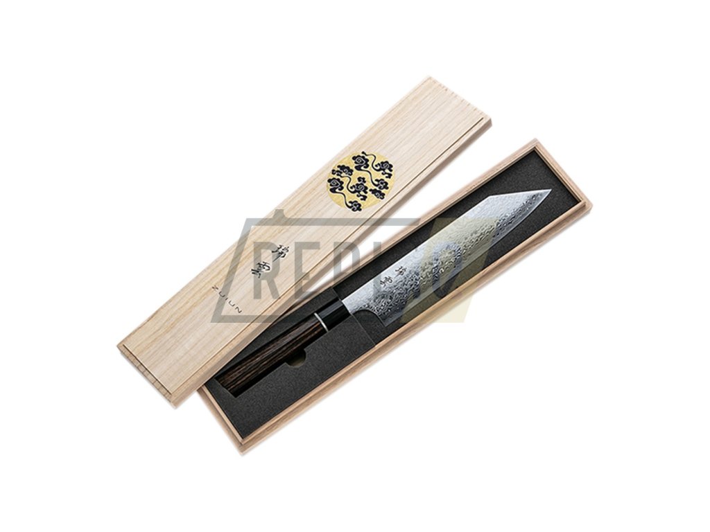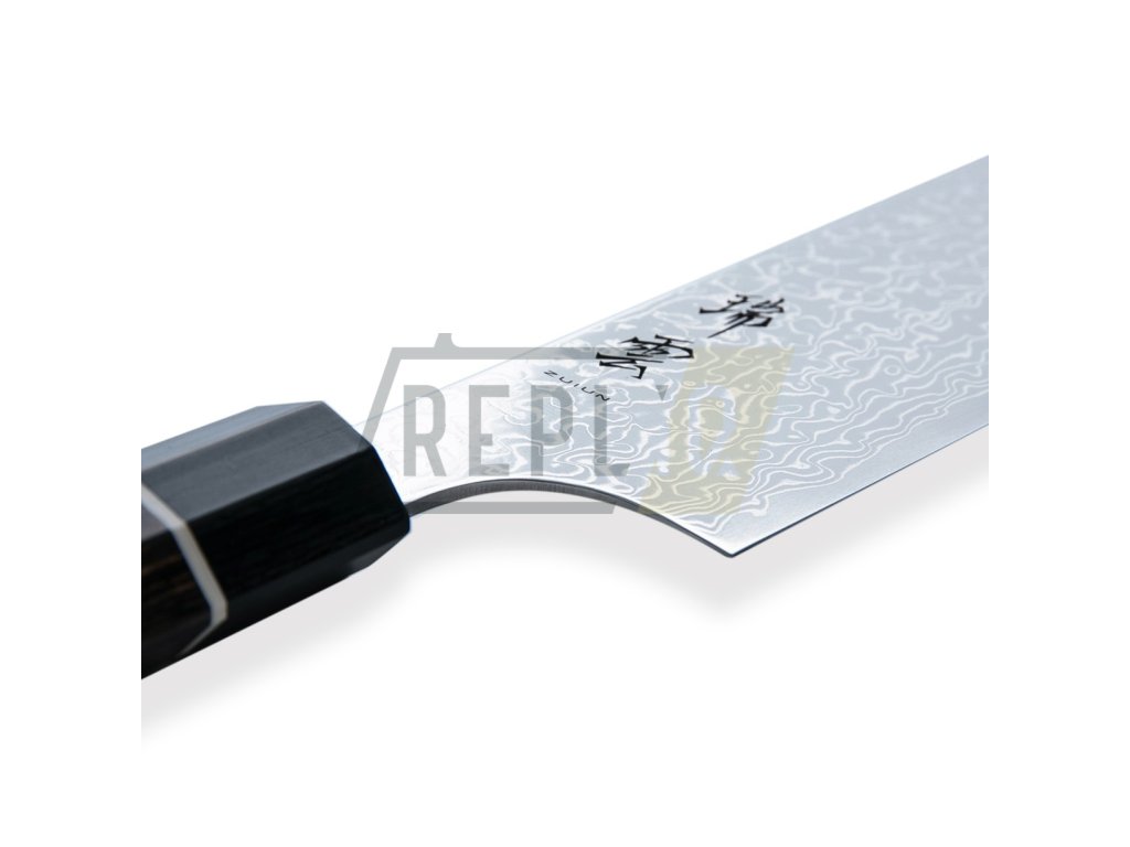 Nůž KIRITSUKE/Sujihiki ZUIUN má ultra ostré řezné jádro z japonské práškové oceli SPG2, které je velmi dobře chráněno proti korozi. Japonská prášková ocel SPG2 má dlouhotrvající ostrost při tvrdosti R63 +/- 1 Rockwella. Jádro z japonské práškové oceli SPG2 je vloženo mezi 62 vrstev 2 nerezových damascénských ocelí (damascus steel), které zajišťují mimořádnou odolnost a houževnatost. Dokonale vyvážená, přesně zúžená čepel japonského tvaru s třpytivým damascénským vzorem minimalizuje tření při řezu a zabraňuje přilepení krájeného materiálu k čepeli. připomínající vlnky na povrchu písečných dun v poušti je jedinečný, neopakovatelný a stane se symbolem Vaší individuality.