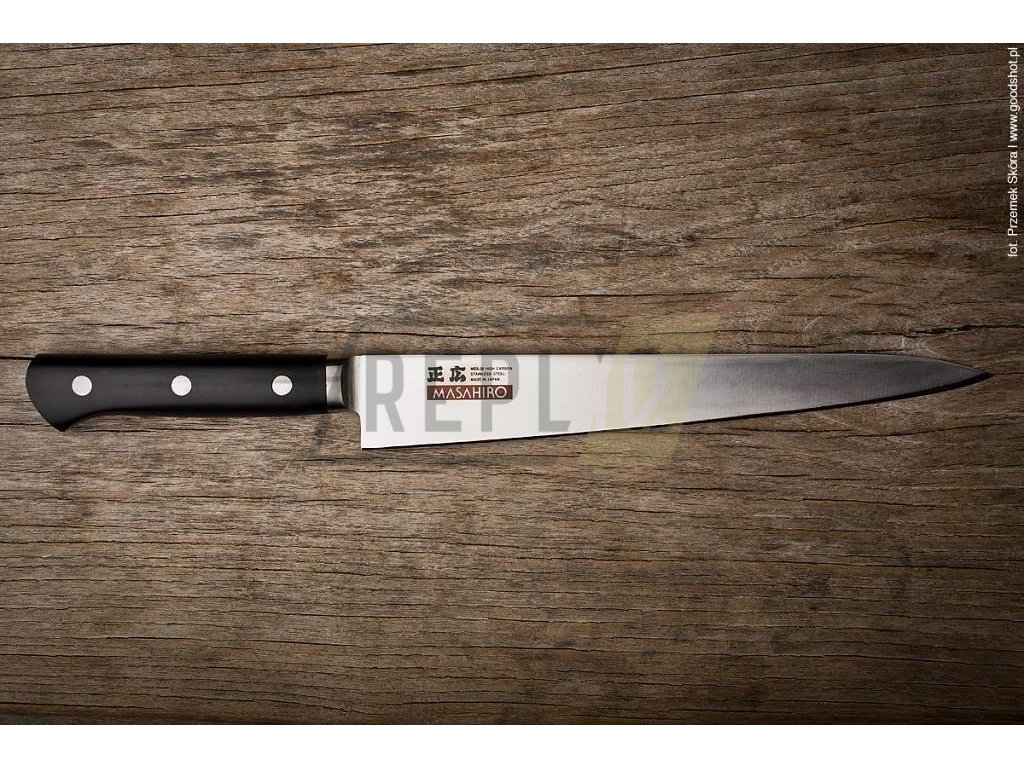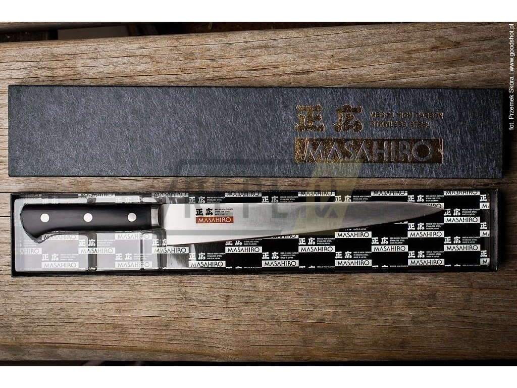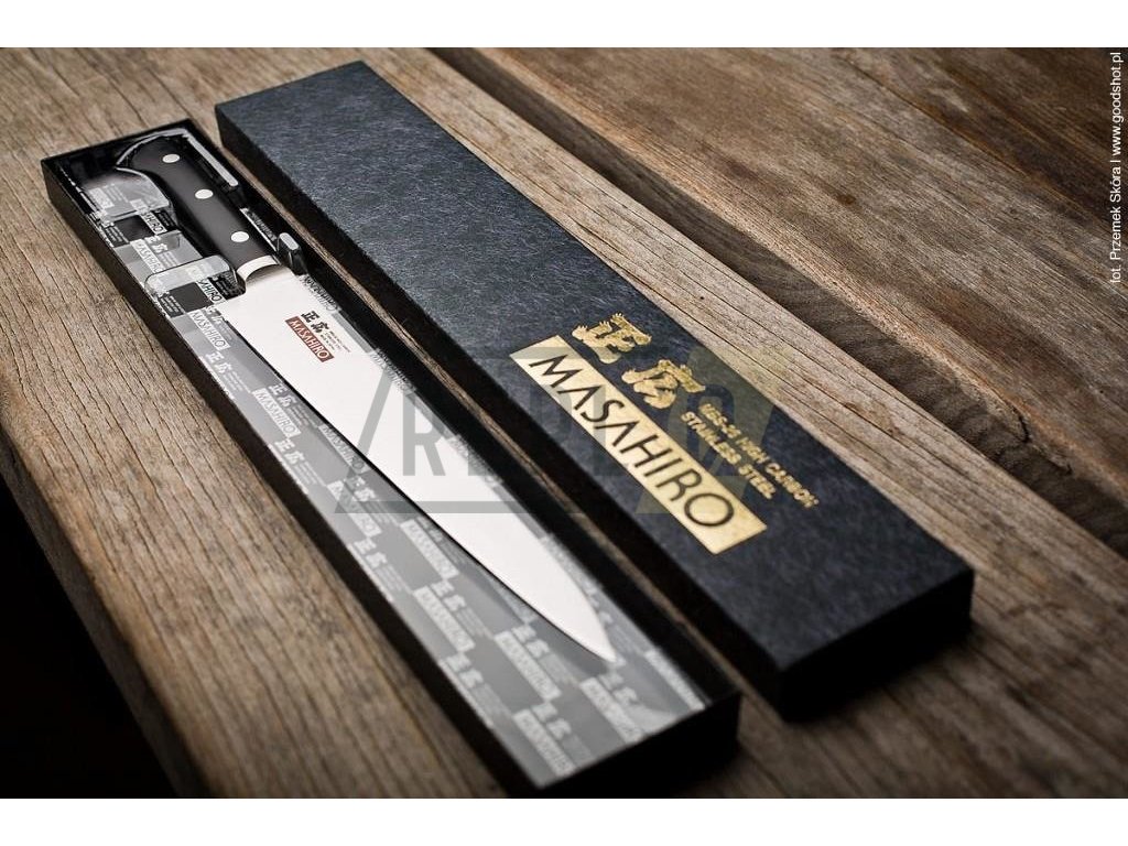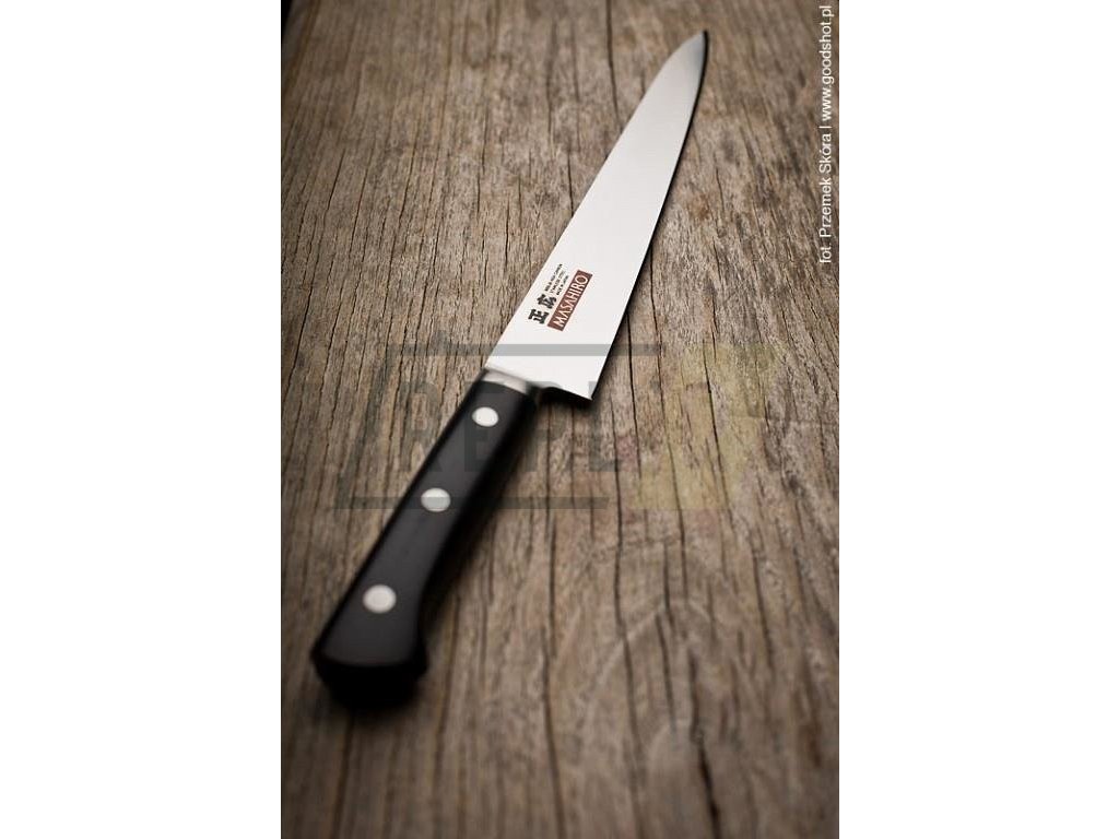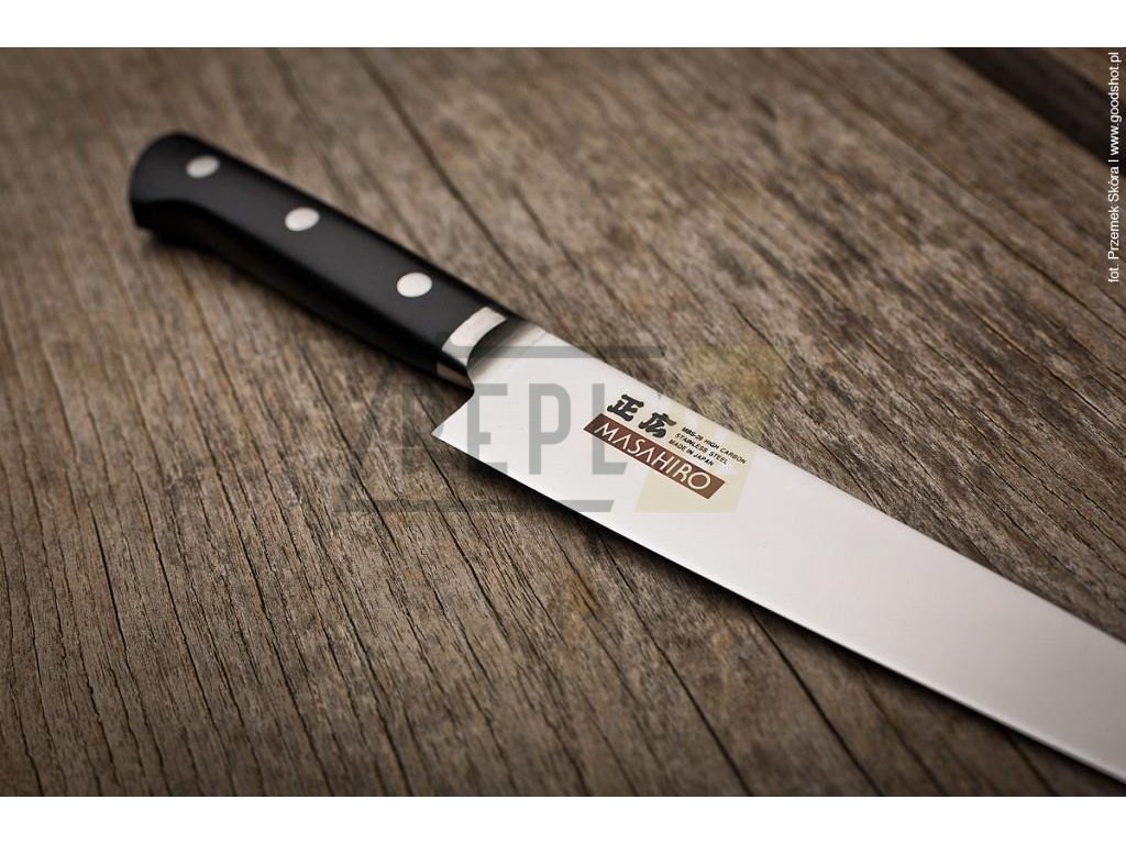Masahiro MV-H Nůž s délkou čepele 240 mm je ideální krájecí nůž. Dlouhá, štíhlá a poměrně ohebná čepel je určena k ořezávání malých porcí měkkých hlavních jídel, jako je pečená drůbež nebo ryby připravované vcelku. Dlouhý břit vytváří při krájení dokonale rovnoměrné plátky. Nůž lze úspěšně použít i k filetování.