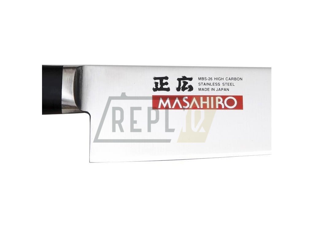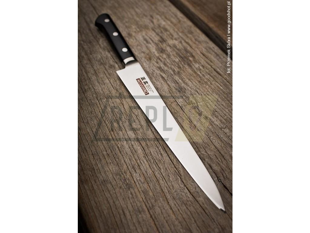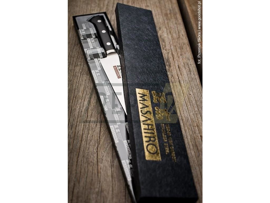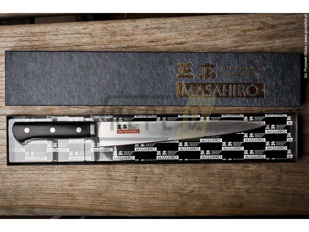 Masahiro MV-H Nůž s délkou čepele 270 mm je ideální krájecí nůž. Dlouhá, štíhlá a poměrně ohebná čepel je určena k ořezávání malých porcí měkkých hlavních jídel, jako je pečená drůbež nebo ryby připravované vcelku. Dlouhý břit vytváří při krájení dokonale rovnoměrné plátky. Nůž lze úspěšně použít i k filetování.