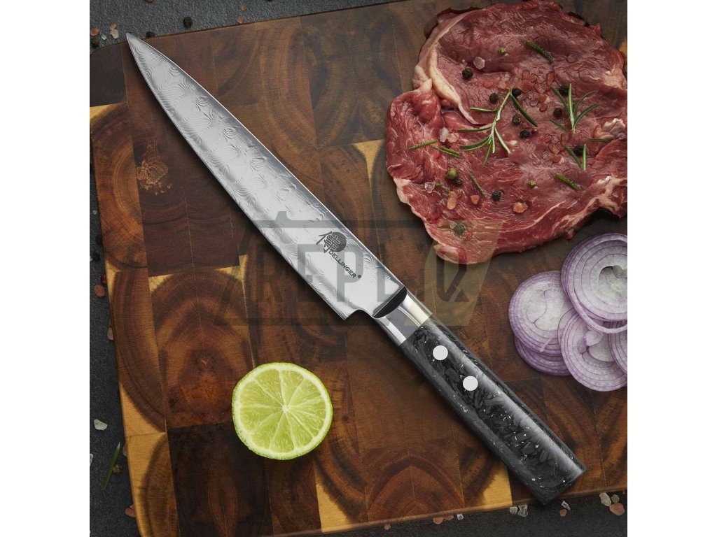 Ostrý plátkovací nůž s damaškovou čepelí a lehkou karbonovou rukojetí