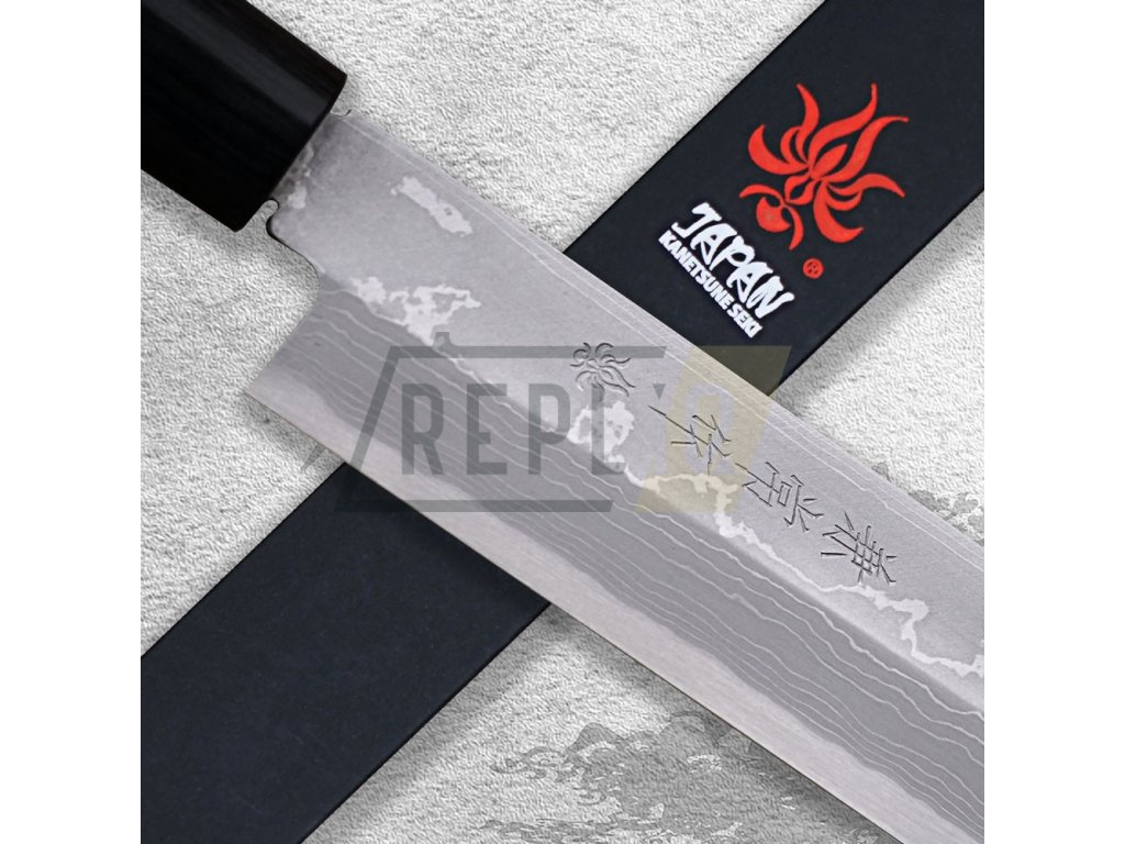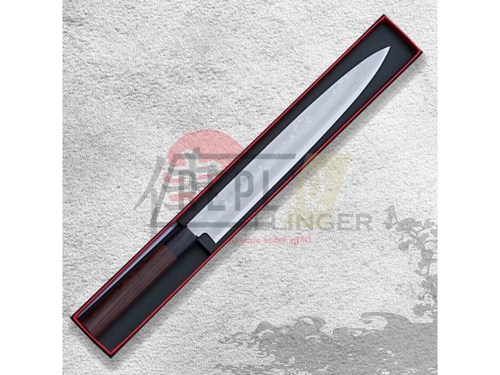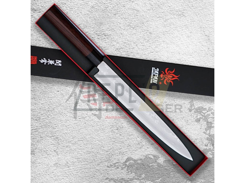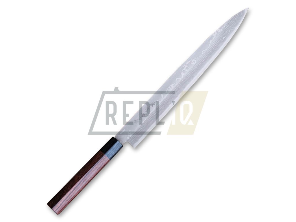 Extrémně ostrý nůž Yanagiba ze série Kanetsune White Steel KC-400 series je vyroben z oceli White steel #2 core, 11 layers damascus. Je to dlouhý krájecí nůž broušený jen z jedné strany, určený k řezání tenkých plátků ryb pro sushi a sashimi. S tímto nožem snadno nakrájíte velké kusy masa (pečeně), ale i tenké plátky zeleniny. Jeho překrásná elegantní tenká čepel je schopna řezat přísady v dlouhých nepřerušovaných řezech a tím zachovat jejich celistvost a svěžest. Yanagiba je jedním z nejdůležitějších tradičních japonských nožů a je součástí repertoáru mnoha kuchařů. Dokonce i nejjednodušší úkoly s tímto krásným a funkčním nožem jsou povýšeny na mimořádný zážitek. Japonské umění, preciznost a nové technologie činí tento nůž z damaškové oceli jedinečným a nenapodobitelným.