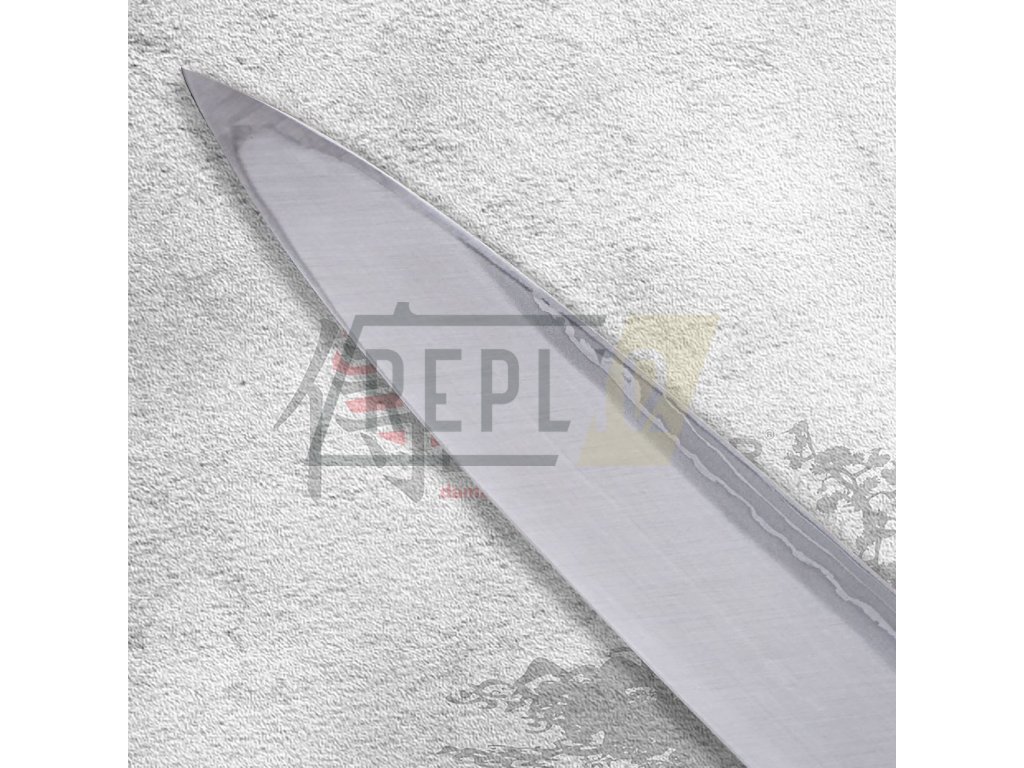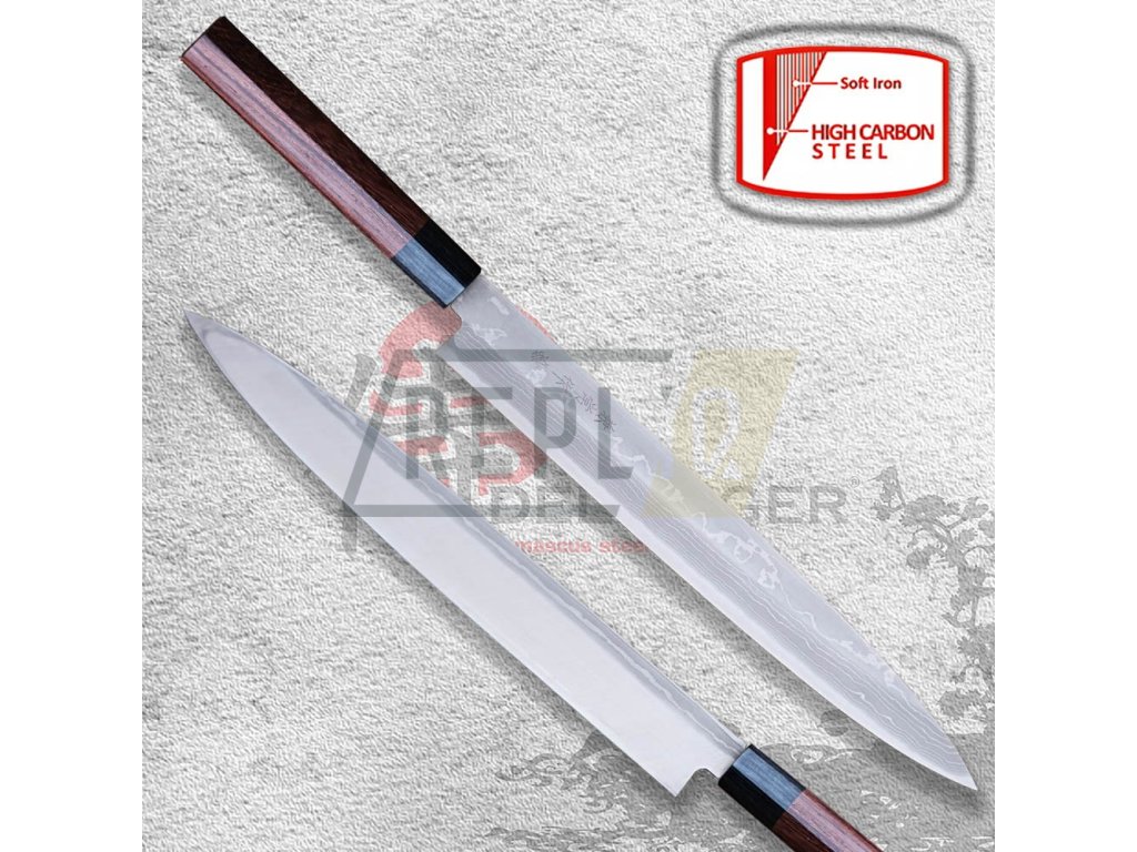 Jádro čepele těchto nožů je kované z vysoce uhlíkové oceli White Steel #2. Tato ocel díky tomu, že je legovaná chromem a wolframem, má vynikající retenci ostří a odolnost. Je velmi oblíbená u japonských výrobců nožů. Tvrdost nože je 60-61 HRC. Nádherná damašková čepel je složená z 11 vrstev a mimořádně ostrého řezného jádra. Čepel je osazena tradiční japonskou rukojetí ve tvaru písmene „D“ z červeného santalového dřeva, bolster je z černého dřeva Plywood.