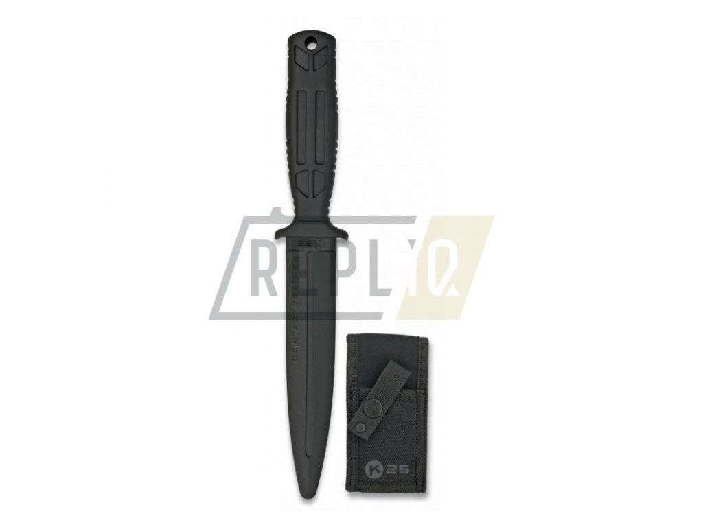 Cvičný gumový nůž značky K25 v černém provedení. Dodáván s nylonovým pouzdrem.