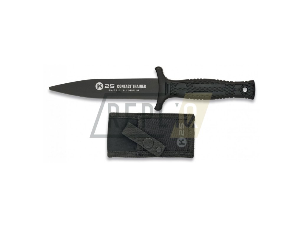 Cvičný hliníkový nůž značky K25 v černém provedení. Dodáván s nylonovým pouzdrem.