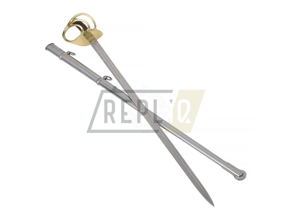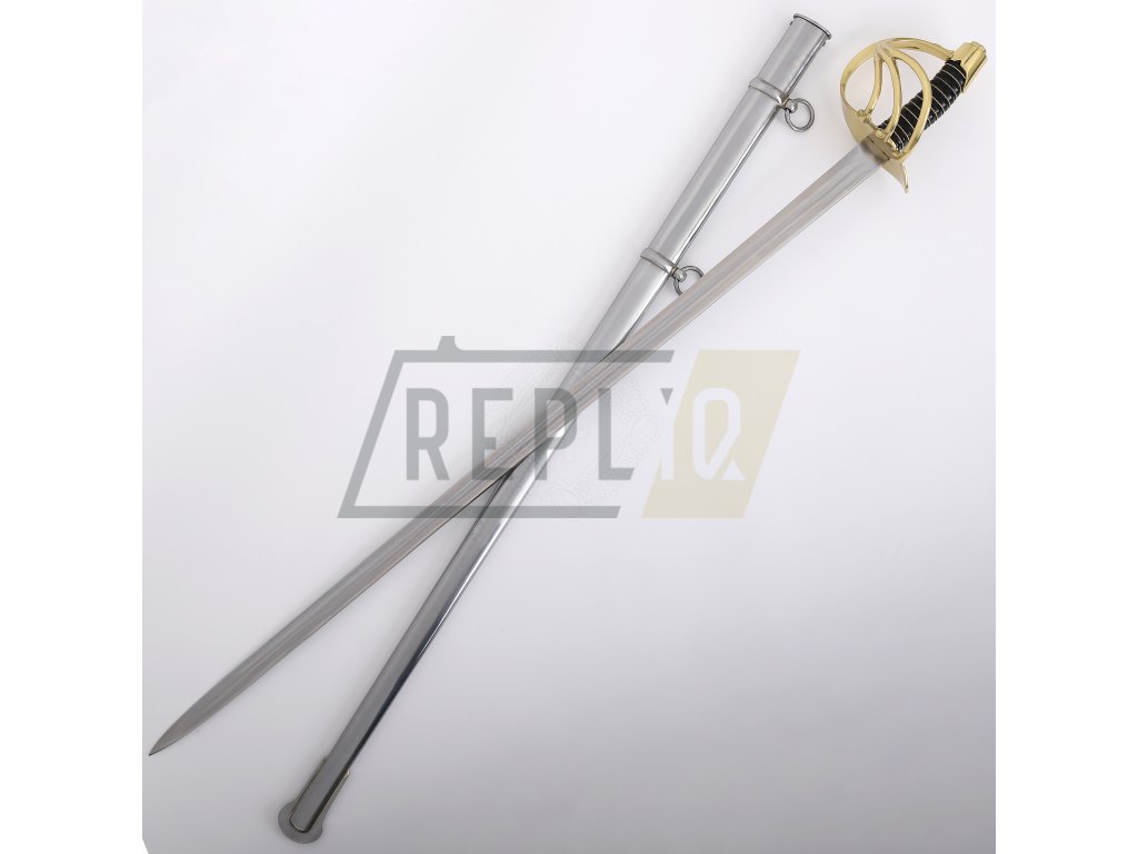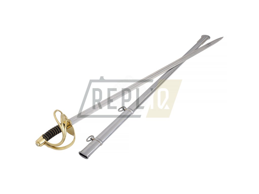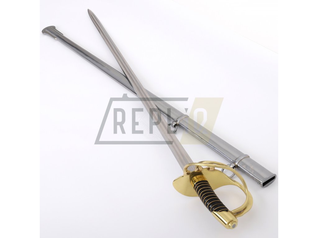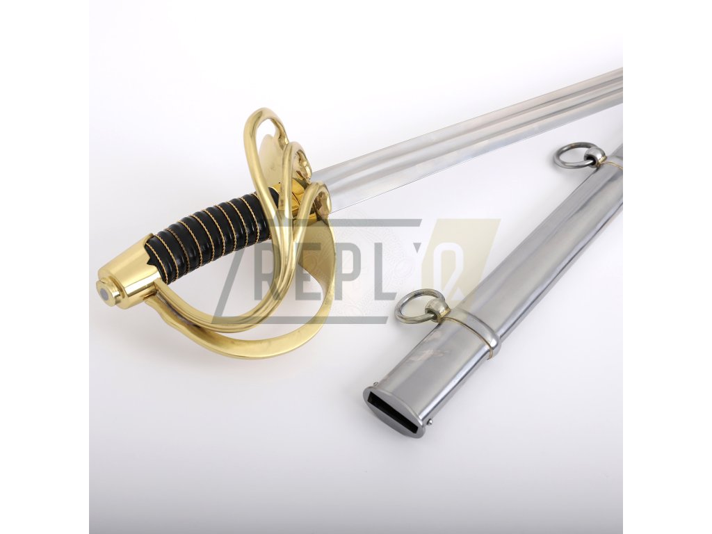 Francouzský napoleonský kyrysnický meč z roku 1801Toto je francouzský kyrysnický meč vzor 1801. Jedná se o těžkou jezdeckou šavli s rovnou čepelí, protože Francouzi dávali přednost bodání před sekáním. Tato replika váží něco málo přes 3 libry (1360g), což je značná hmotnost potřebná k provedení útoku kopím. Distálně se zužující čepel je u rukojeti silná přes 1/4" (6,3 mm) a má dvojitý žlábek stejně jako originály. Dodává se naostřená z výroby. Záštita a hlavice jsou z mosazi. Rukojeť s omotávkou z krouceného drátu je potažená kůží.