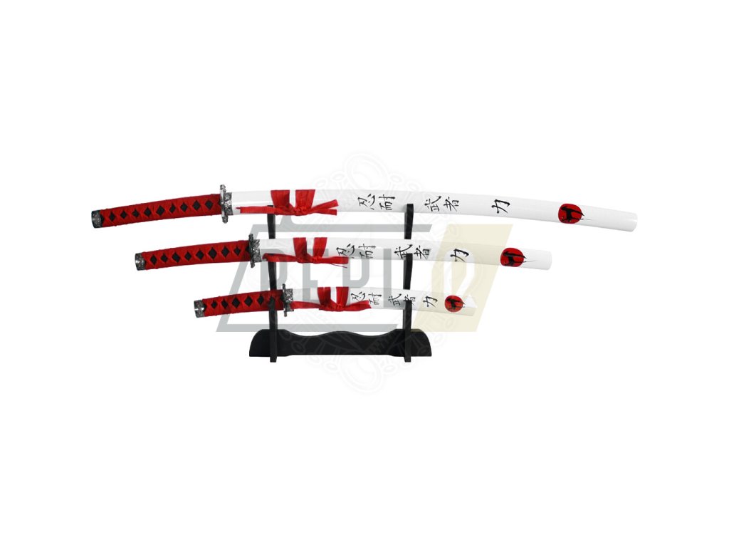 Sada samurajských mečů Red&White, čtyřdílnáKatana: Délka čepele 69cm, celková délka 97cm, pochva 100cm