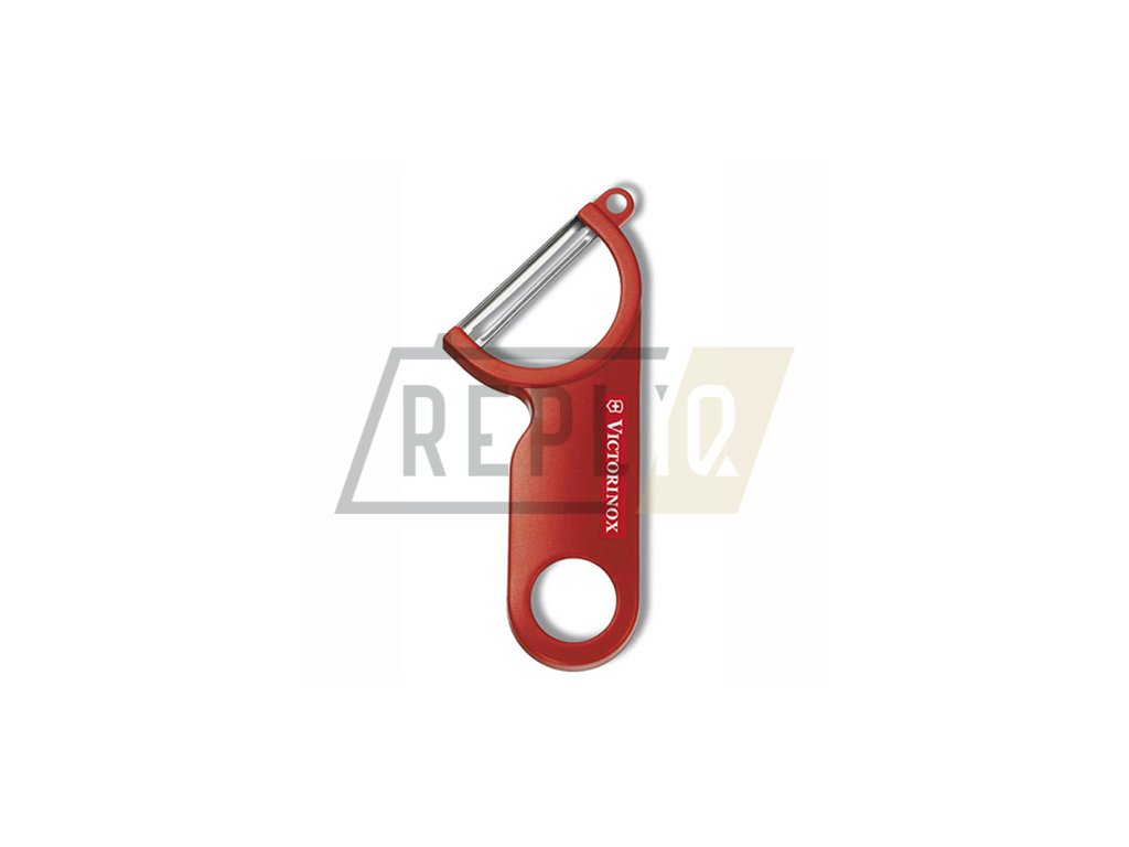 - Škrabka na brambory z červeného plastu, nerezová čepel.