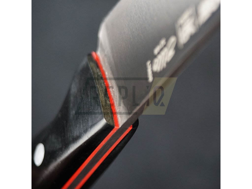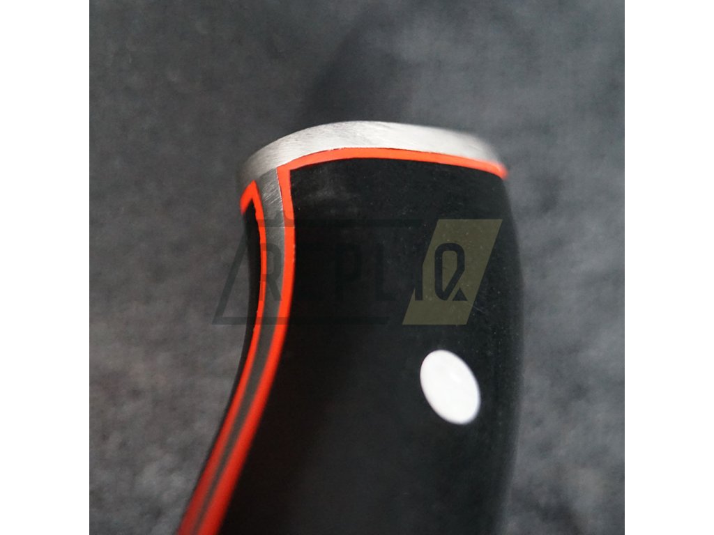 Rukojeť je vyrobena z odolného černého kompozitu s červenými příložkami, který spojuje elegantní vzhled s maximální funkčností. Materiál je navržen tak, aby odolal nárazům, vlhkosti i tukům a zároveň poskytoval pevný a hygienický úchop i při delší práci.