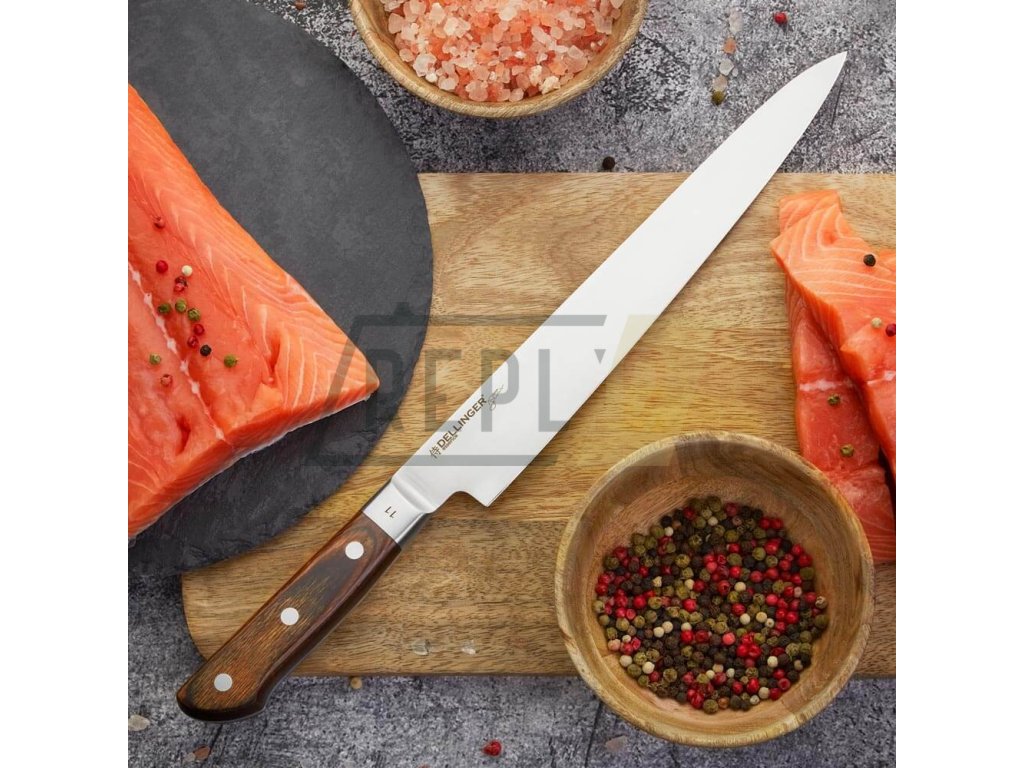 Jedenáctý nůž z nové série Dellinger Essence. Nejoblíbenější nůž šéfkuchaře Honzy Punčocháře z celé série Dellinger Essence. Honza sám říká, že je to nůž, který má duši – univerzální pomocník, se kterým se dá nakrájet úplně všechno. Stačí se nebát jeho velikosti! A my s jeho názorem souhlasíme. „Dlouhán“ je fakticky skvělý nůž, se kterým nakrájíte jemnou šalotku, tenoučké plátky parmské šunky nebo prostě pořádnej kus steaku. Je vyroben z prvotřídní německé oceli 1.4116, známé pro své skvělé řezné vlastnosti, dlouhou výdrž ostří a snadnou údržbu. „Dlouhán“ je prostě nůž, který si zamilujete a nebudete ho chtít dát z ruky.